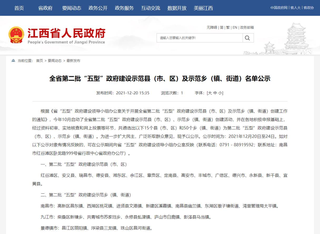 根据《省“五型”政府建设领导小组办公室关于开展全省第二批“五型”政府建设示范县(市、区)及示范乡(镇、街道)创建工作的通知》,今年10月启动了全省第二批“五型”政府建设示范县(市、区)、示范乡(镇、街道)创建活动,并在各地积极申报基础上,经过资料初审、实地核查和网上投票等环节,共遴选出以下15个县(市、区)和50个乡(镇、街道)为第二批“五型”政府建设示范县(市、区)、示范乡(镇、街道)。为进一步发扬民主,广泛听取群众意见,现予以公示。