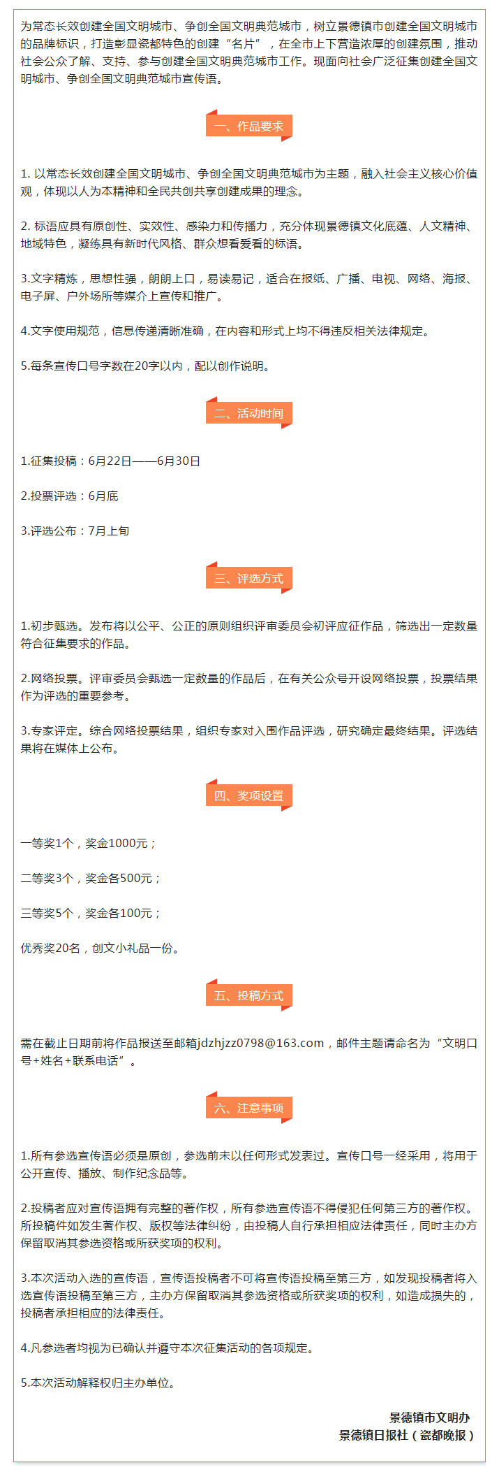 征集景德镇市创建全国文明城市、争创全国文明典范城市宣传语