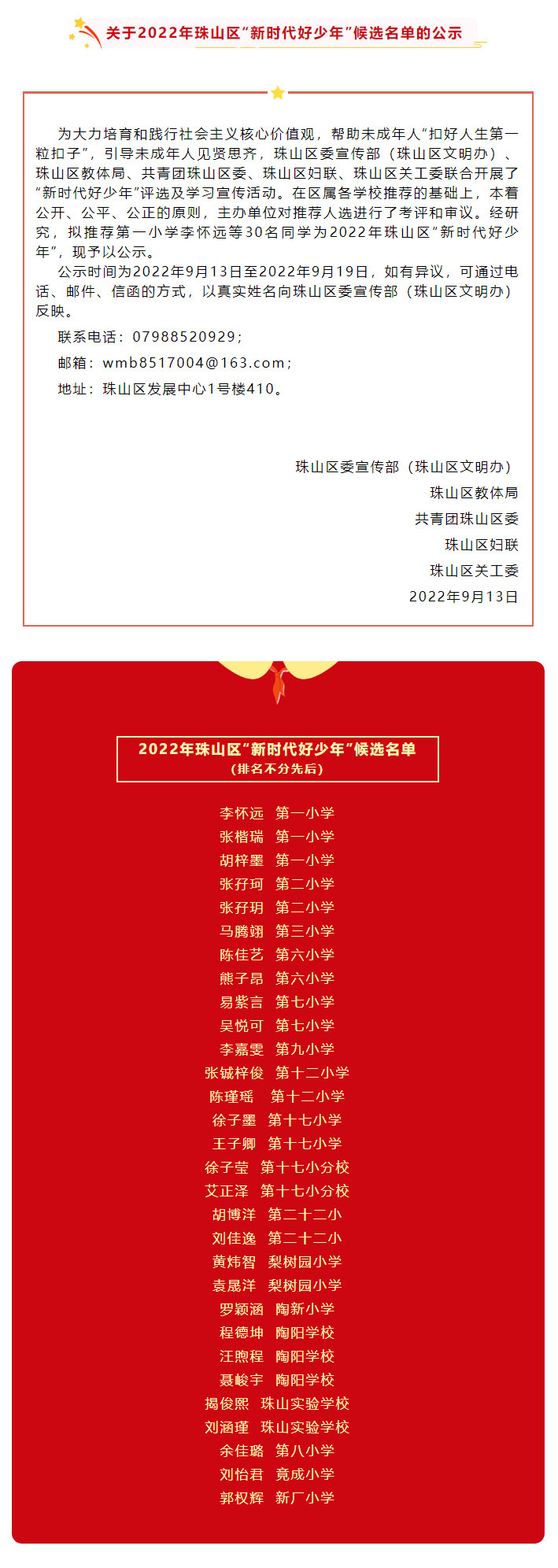 关于2022年珠山区“新时代好少年”候选名单的公示