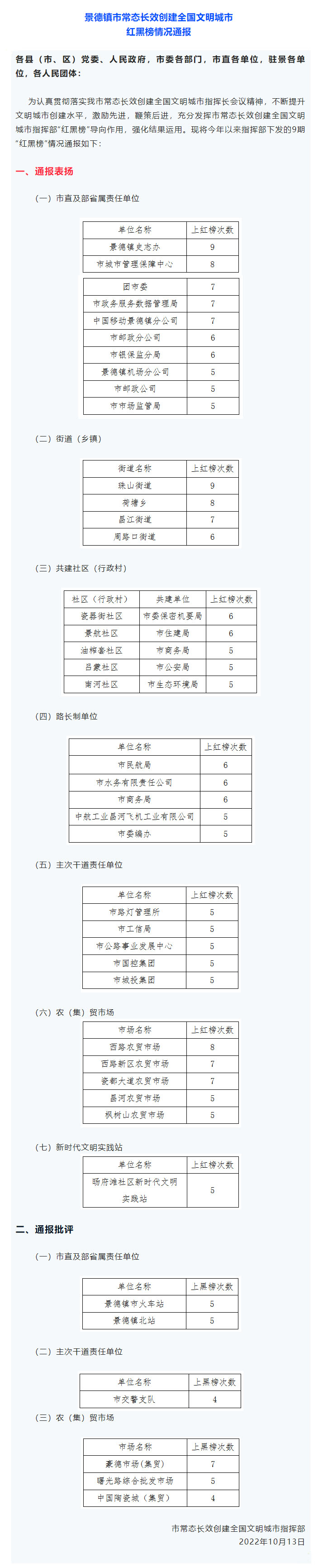 景德镇市常态长效创建全国文明城市 红黑榜情况通报