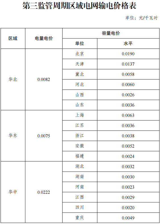 第三监管周期区域电网输电价格表