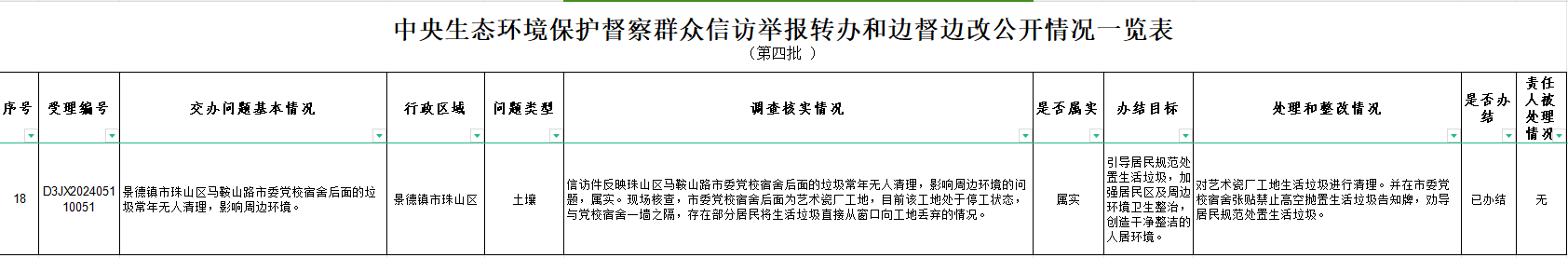 截至5月21日,对中央第三生态环境保护督察组向珠山区移交的第四批群众信访举报件1件,各责任单位均按要求上报调查处理情况。根据督察要求,群众信访举报转办和边督边改公开情况一览表将在报纸、网站等媒体上公布。