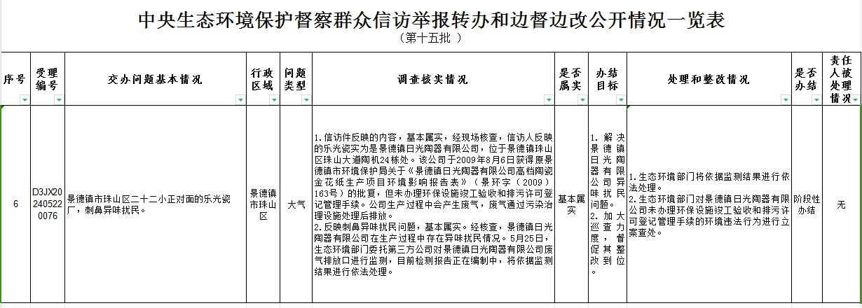 截至6月1日,对中央第三生态环境保护督察组向珠山区移交的第十五批群众信访举报件1件,各责任单位均按要求上报调查处理情况。根据督察要求,群众信访举报转办和边督边改公开情况一览表将在报纸、网站等媒体上公布。