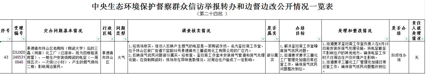 截至6月10日,对中央第三生态环境保护督察组向珠山区移交的第二十四批群众信访举报件1件,各责任单位均按要求上报调查处理情况。根据督察要求,群众信访举报转办和边督边改公开情况一览表将在报纸、网站等媒体上公布。