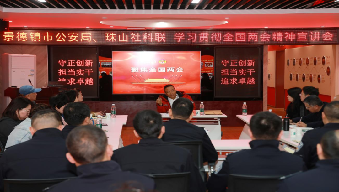 为深入学习宣传贯彻全国两会精神,推动全国两会精神深入人心。3月20日上午,由市社科联作为指导单位,珠山区委宣传部、珠山区社科联联合珠山区总工会走进市公安局开展“筑梦现代化 奋进新时代”2025年全国两会精神珠山社科大讲堂宣传宣讲活动,在市公安局三楼思想文化教育中心圆满举办。市公安局党委委员、政治部主任范有光出席活动,活动邀请到第十四届全国人大代表、景德镇市人民政府参事、景德镇学院海上丝绸之路研究院院长、二级教授王安维进行现场宣讲,参加活动对象有市公安干警、珠山社科系统老师代表、工会爱心驿站代表、市社科普及基地代表50余人。