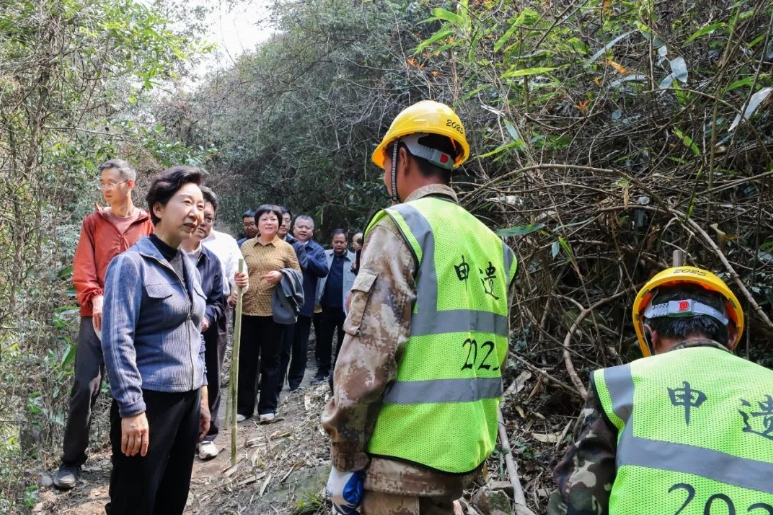胡雪梅、陈克龙等领导在申遗要素点长岭瓷石矿(大午坑、小坞里)片区调研。(全媒体记者 刘定远 摄)