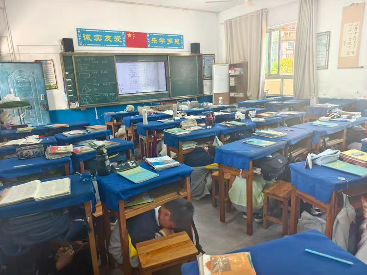 随着校园广播响起急促的警报声,各班级同学迅速躲入桌底,利用课桌的稳固抵御地震带来的伤害。