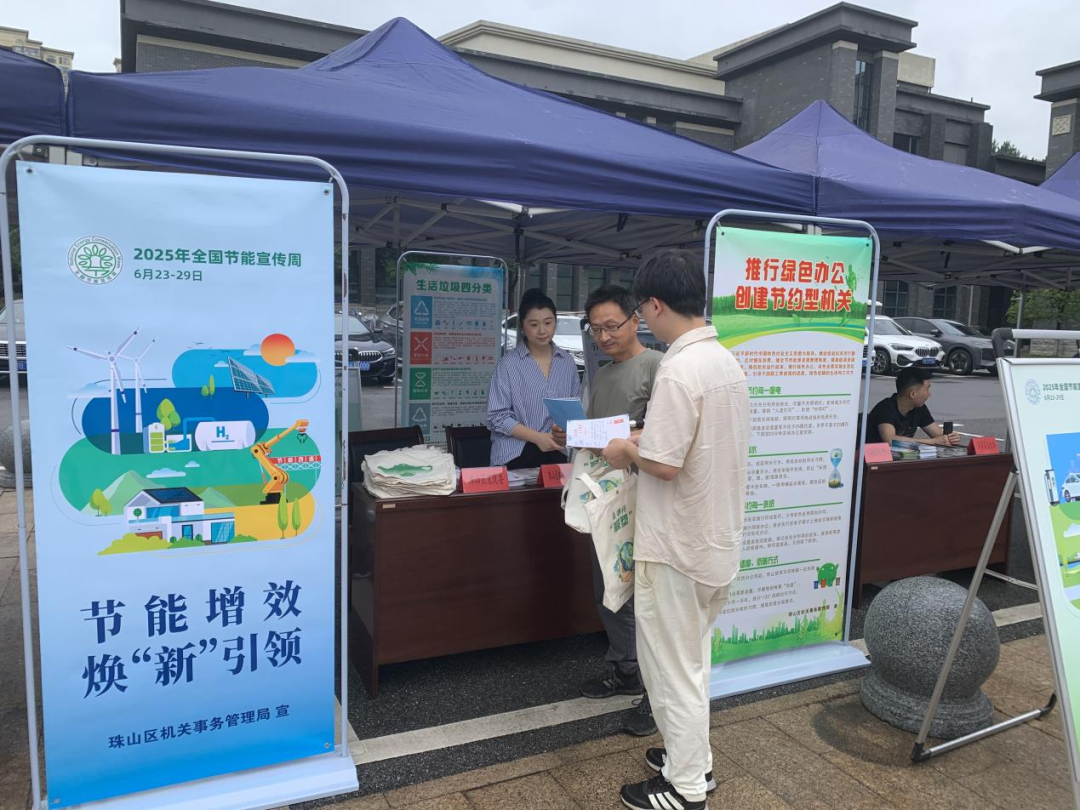 在节能宣传周期间,珠山区机关事务管理局通过设立展板、现场咨询、发放宣传手册及环保宣传袋等方式,向干部职工和来往群众介绍节能降碳工作成果、节约能源资源法律法规、消费品以旧换新政策及绿色低碳、生活垃圾分类、反食品浪费、节约用水等节能知识,倡导干部职工和市民践行绿色低碳的生产生活方式。