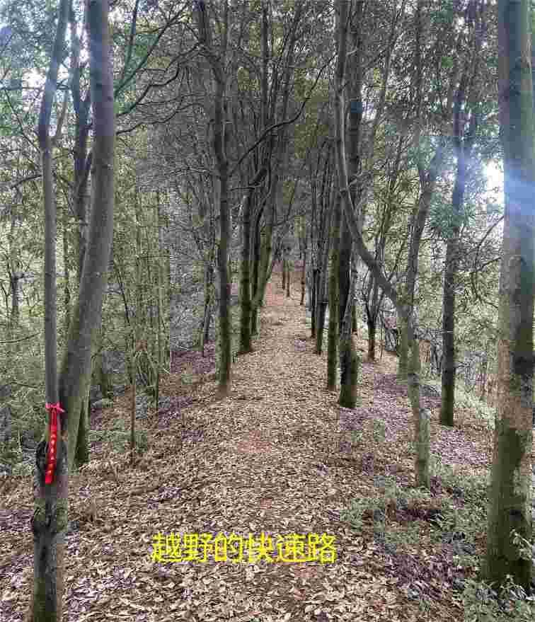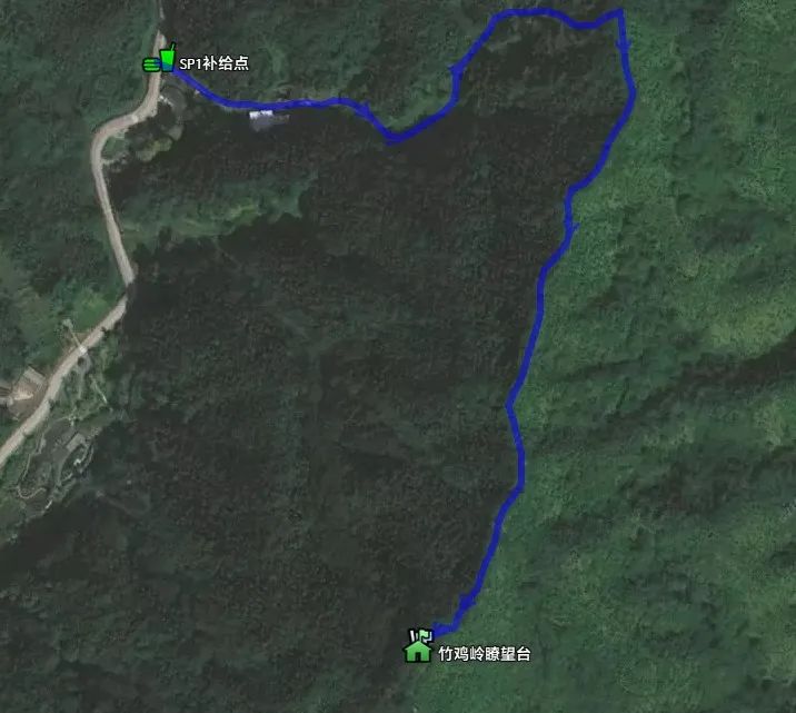 从双坑上山点,这设置了SP1补给点,为了防止选手抄近道,这增设打卡计时。吃饱喝足后左转开始爬山,这段上山的距离540米,爬升有168米,到达山脊后,右转沿着山脊在林间山路山前行,上下坡不大,路况稍好,跑步、徒步皆可。看到一排排小木屋就到达竹鸡岭瞭望台。