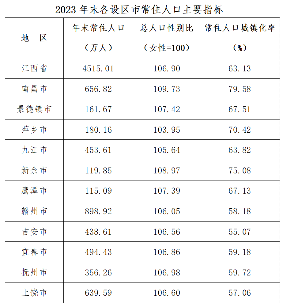 按照国家统计局统一部署,2023年江西省5‰人口变动抽样调查以全省为总体,以11个设区市为子总体,采取多阶段、分层、概率比例的抽样方法,全省共抽取2482个村级单位为调查样本,调查人口32万余人。现将根据5‰人口变动抽样调查数据推算的全省2023年常住人口主要数据公布如下: