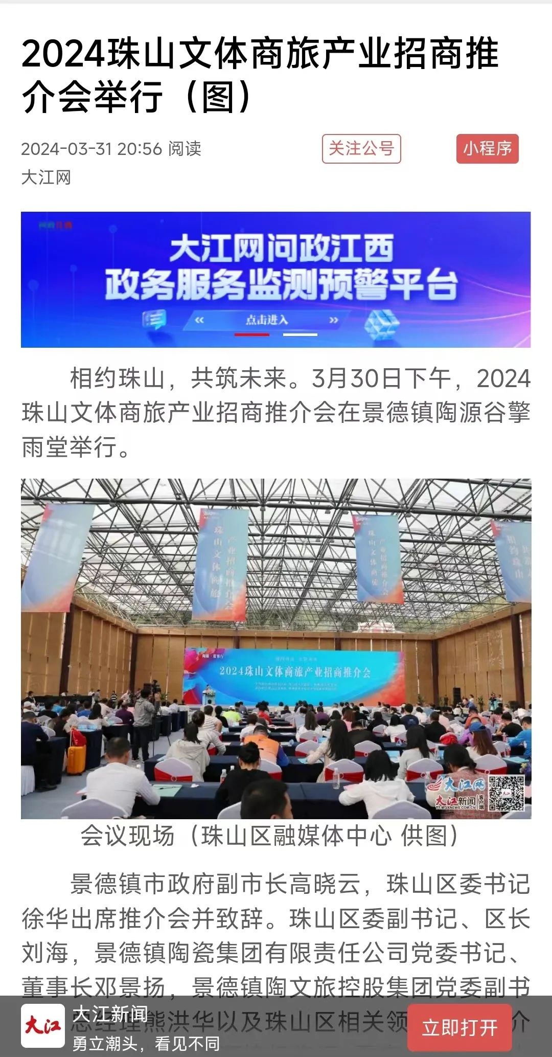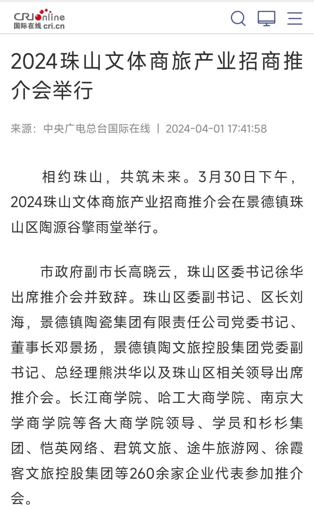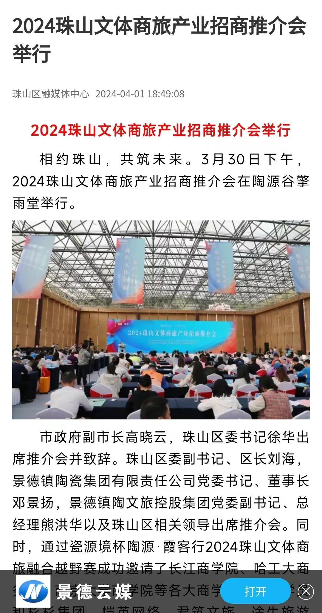 中国网、国际在线、凤凰网、江西新闻、江西广播电视台、大江网、景德云媒关注珠山区文体商旅产业招商推介会盛况