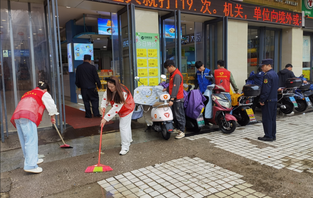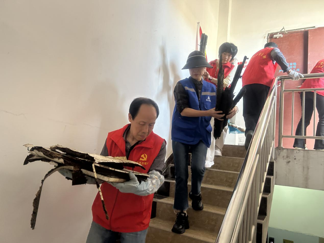 活动中,志愿者们徒手搬杂物,铲牛皮癣,清理楼道蜘蛛网,还手拿扫帚对小区场院以及绿化带的垃圾、烟头等进行仔细清扫,对排水沟的树叶、垃圾进行清理,同时小区店面门口存在的飞线充电,非机动车乱停放等,也逐一向居民劝导,即使的大雨也挡不住志愿者们开展环境整治的热情和干劲,大家细心地把“藏”在绿化带内、“躲”在机动车下边,楼道死角的垃圾都一一清理出来,确保卫生大扫除全覆盖,无死角,让看得见和看不见的地方都一样整洁干净。
