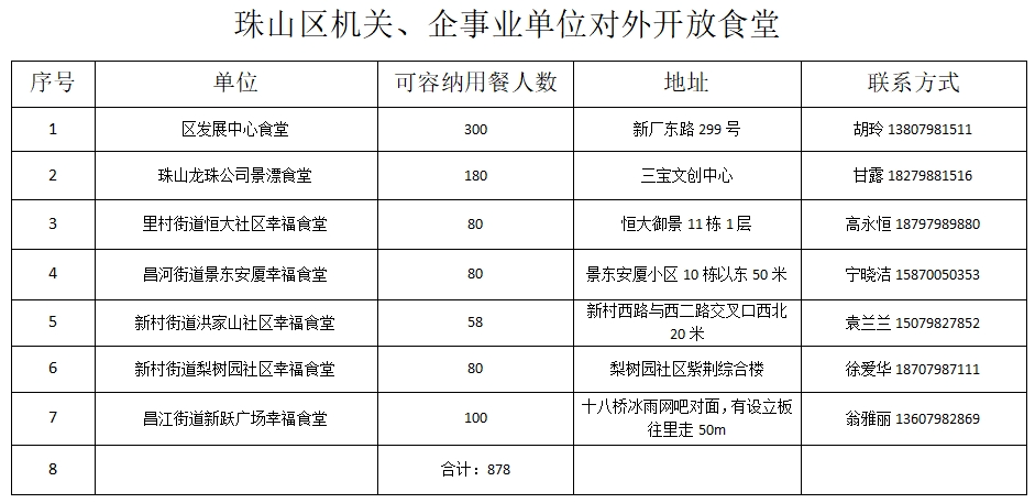 同时,珠山区发展中心食堂、陶源谷·三宝珠山龙珠公司景漂食堂、里村街道恒大社区幸福食堂等7家食堂(详见列表)也将对外地游客开放,届时,这些食堂总共可为外地游客提供近900个餐位。