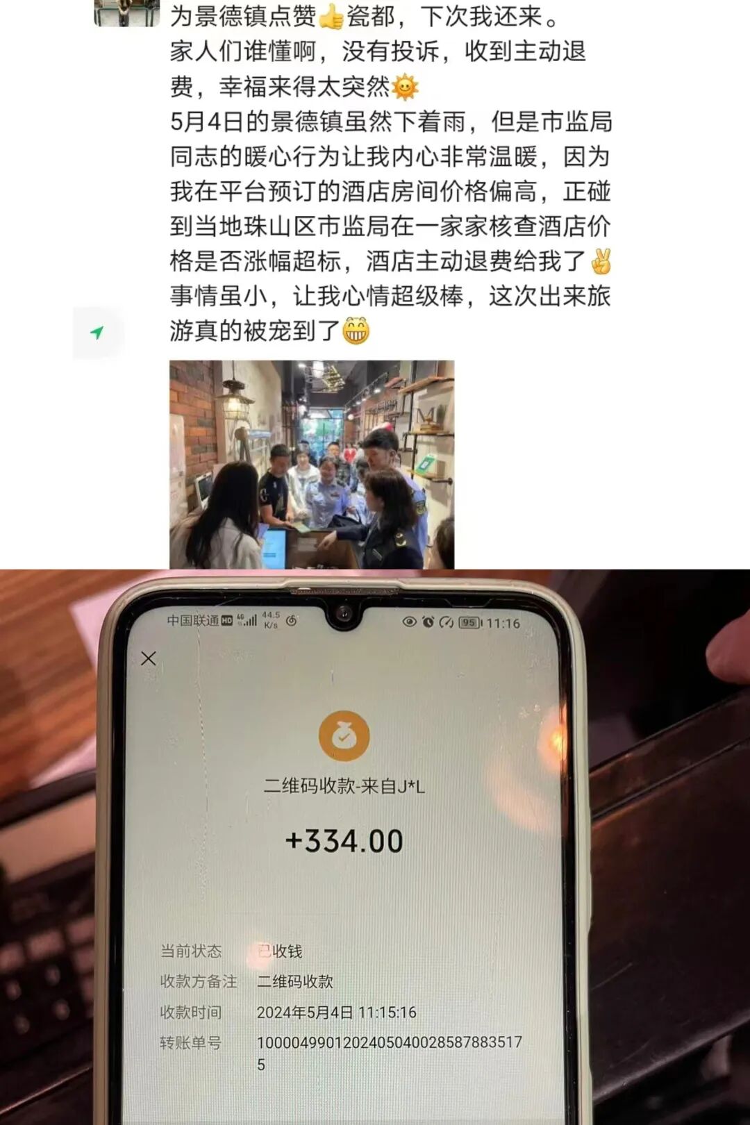 5月4日,来自南昌的游客雷先生到我市旅游,支付 599元在某平台预订了一晚大床房,准备入住珠山区某家酒店,正碰到市区两级市场监管局冒着大雨在一家家核查酒店价格是否涨幅超过价格承诺,经过执法人员核实,雷先生入住的酒店经营者按照价格承诺将差价退给了雷先生,雷先生表示“幸福来得太突然”“真心被宠到了”。