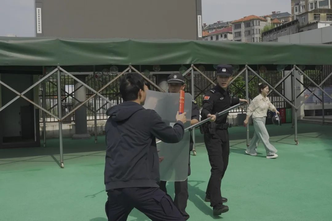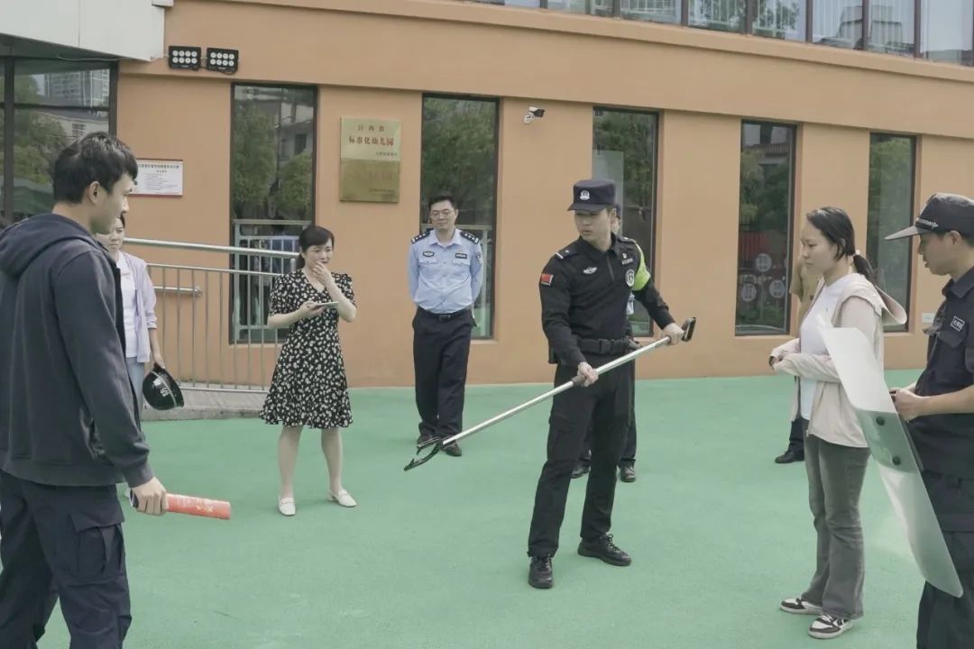 演练前,民警向幼儿园教师和保安示范了盾牌、钢叉、防暴棍等常用防卫器械的正确使用方法,帮助大家正确掌握使用器械的要领。