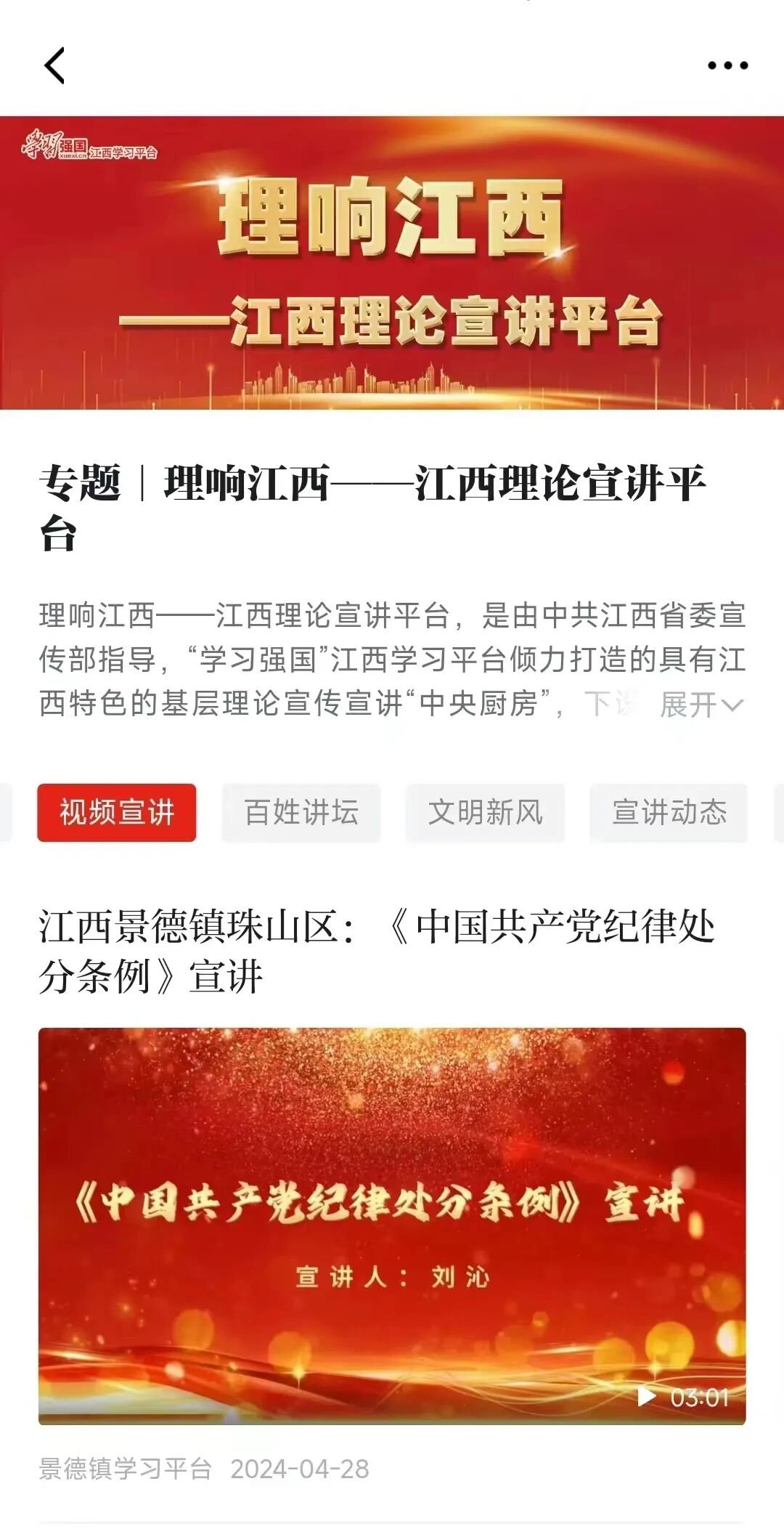 “小巷讲堂”党纪微宣讲视频受众更广泛。珠山区用好全国基层理论宣讲先进集体“小巷讲堂”品牌优势,定制“线上+线下”微宣讲课程,组织拍摄“小巷讲堂”党纪微宣讲视频,打造了具有珠山特色的党纪学习教育宣讲菜单。