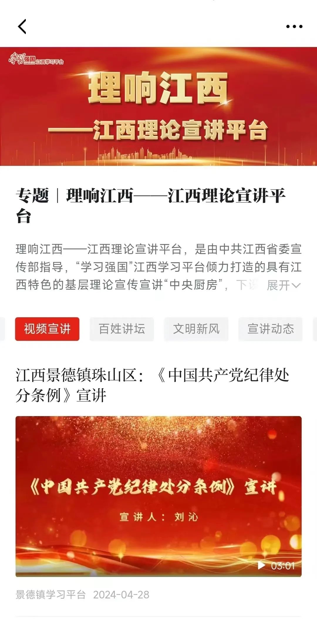 珠山区广泛发动各街道(经开区)、各单位、各学校,挑选精兵参与微宣讲视频拍摄,充分发挥千年瓷都城市中心区、国家试验区建设核心区的文化底蕴和发展优势,讲好党纪促发展,力争出彩出精品。截至目前,珠山区4条党纪微宣讲视频被学习强国景德镇平台选用,1条党纪微宣讲视频被学习强国江西省平台选用,超过2万粉丝在线观看,高质量微宣讲视频“出圈”,党纪学习教育深入人心。