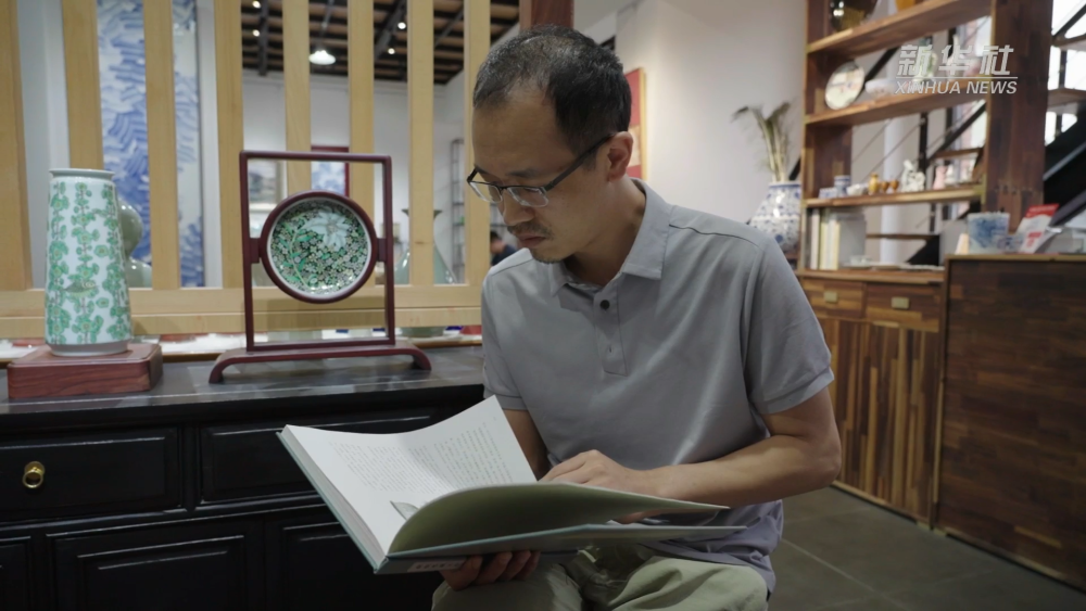 机暇社创办人郝喜文正在研读陶瓷历史书籍。(视频截图)