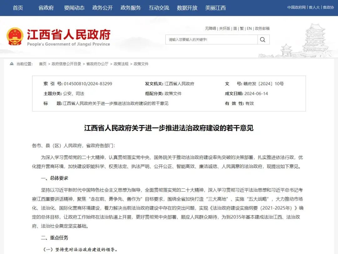为扎实推进依法行政,优化提升营商环境,加快建设职能科学、权责法定、执法严明、公开公正、智能高效、廉洁诚信、人民满意的法治政府,近日,江西省人民政府印发了《关于进一步推进法治政府建设的若干意见》(以下简称《意见》)。