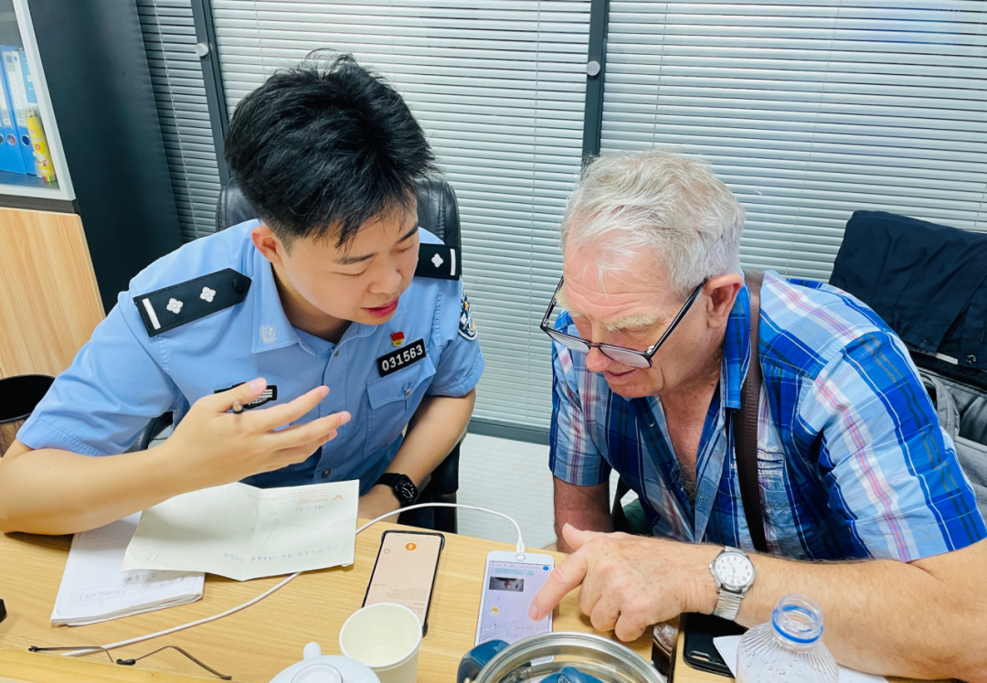 2024年8月12日,我市突降暴雨,珠山分局新村派出所民警刘中宝在巡逻过程中发现了一名外籍老人,神色焦虑、四处徘徊。民警立即上前询问是否需要帮助,因外籍老人不会说英语及中文,无法获取有效信息,便先将外籍老人带回所内避雨,并立即与分局出入境管理科联系请求协助。得知情况后,出入境民警李昱辰第一时间赶赴现场,为外籍老人提供帮助。