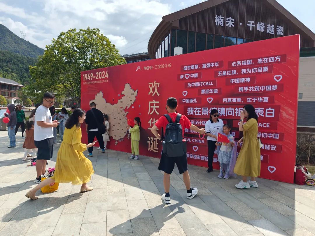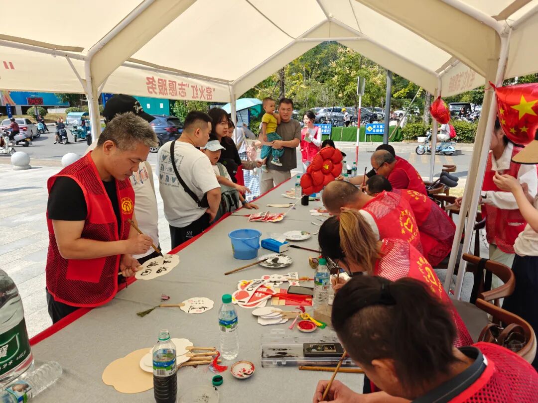 在三宝设计谷,珠山区文联还开展了“文艺志愿红•添彩庆国庆”活动,充分发挥文联志愿者优势,让陶瓷艺术家走进景区,免费为游客提供艺术纸扇,并题字、作画,让游客把陶源谷的风景化作清凉的秋风,留在扇子上带回家去。
