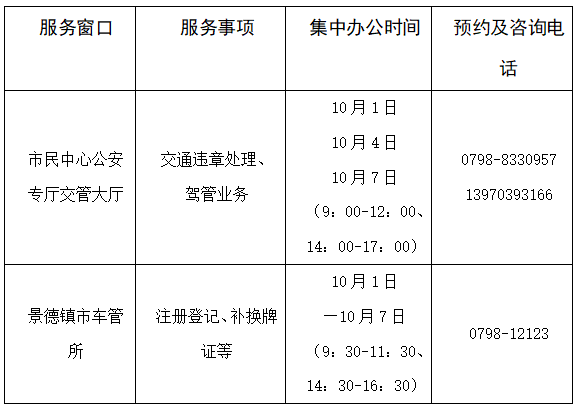 2024年国庆节将至,为方便外出务工、经商、求学返乡群众办证办事,确保错时延时服务不间断,景德镇市城区公安户政、出入境、交管窗口于国庆节积极开展错时延时办公,非延时期间提供预约服务(请工作时间电话预约)。具体如下: