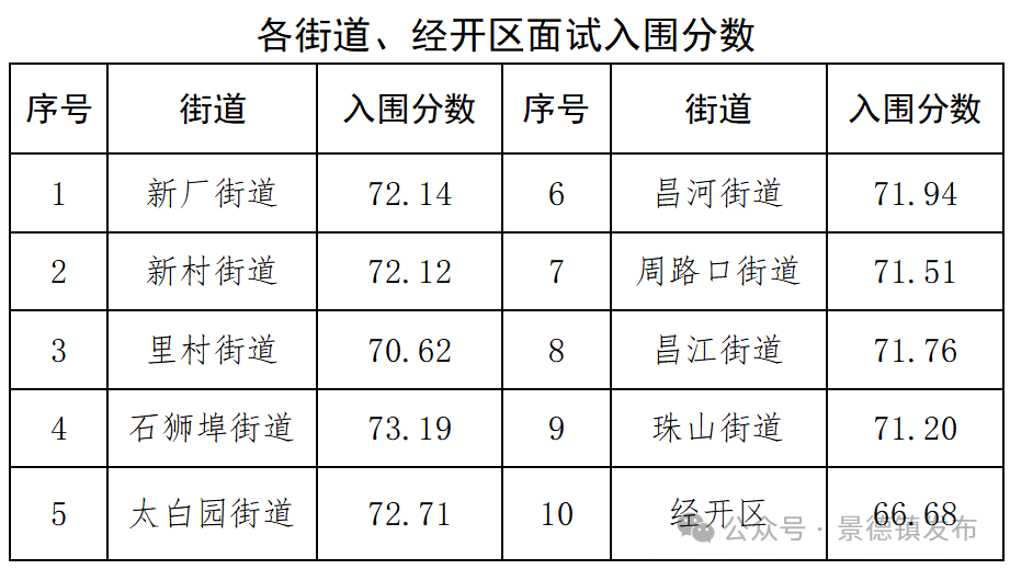 根据各街道(经开区)考生笔试总成绩(含笔试加分)从高分到低分,按招聘计划数1:1.2比例分别确定各街道(经开区)进入面试人员名单(各街道、经开区如遇末位同分情况,一并进入面试)。