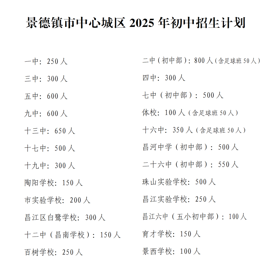景德镇市中心城区初中招生计划共8450人,详见附件。同时,为贯彻落实《江西省青少年足球改革发展实施方案》,推动青少年足球高质量发展,从2025年秋季学期开始,在景德镇二中、十六中、体校初中部各新增一个50人足球特长班。对于未被足球班录取的学生,可依据户籍或房产进行志愿填报。三年后将从足球特长班学生中遴选50人进入二中高中部足球班。具体考核录取办法另行通知。