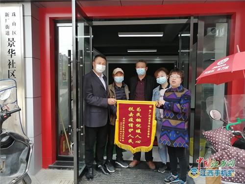 4月22日下午,景德镇景城名郡小区物业公司高层领导做代表为珠山区新厂街道景华社区送来了一面写着“抗击疫情护人民 为民排忧暖人心”的锦旗,感谢社区工作人员在新冠肺炎防控期间携手物业共克时艰,感谢社区工作者为业主们安然度过疫情难熬时作出的牺牲和奉献。社区工作人员冲在疫情防控的第一线,守护辖区居民的安全。