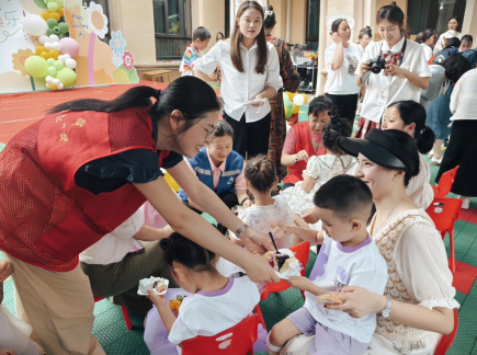 活动最后,老厂社区工作人员为小朋友们送上精美蛋糕,孩子们的脸上露出了灿烂的笑容。他们围在一起,分享着这份美味的礼物,欢声笑语充满了活动现场。一位大班的小朋友兴奋地表示:“这是我收到过最特别的‘六一’礼物,感谢社区的阿姨们的关心和爱护。”