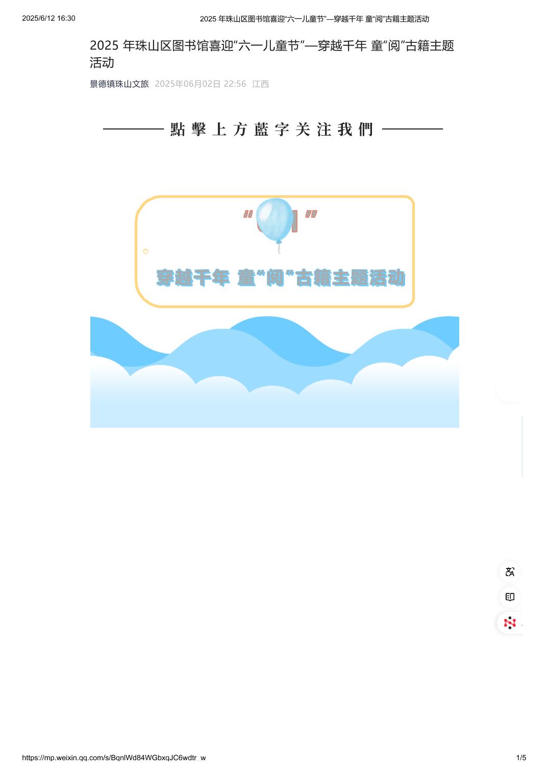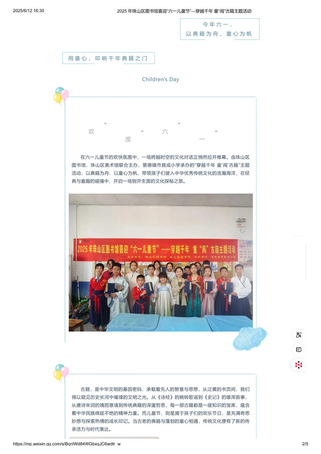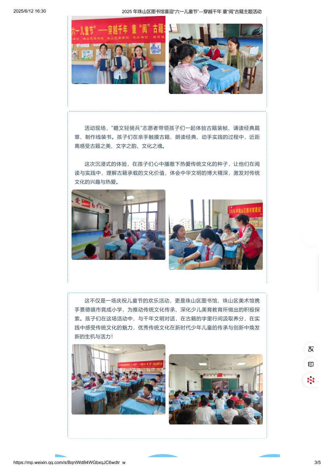 2025 年珠山区图书馆喜迎“六一儿童节”—穿越千年 童“阅”古籍主题活动