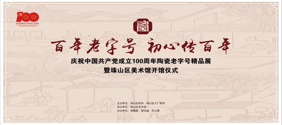 “奋斗百年路,启航新征程”,为庆祝中国共产党成立100周年,珠山区文广新旅局决定于2021年6月8日举办“百年老字号 初心传百年——庆祝中国共产党成立100周年陶瓷老字号精品展暨珠山区美术馆开馆仪式”。景德镇陶瓷老字号是陶瓷文化的一段重要内容。挖掘老字号的文化价值,既是字号的传承历史也是陶瓷文化创新的一条脉络。