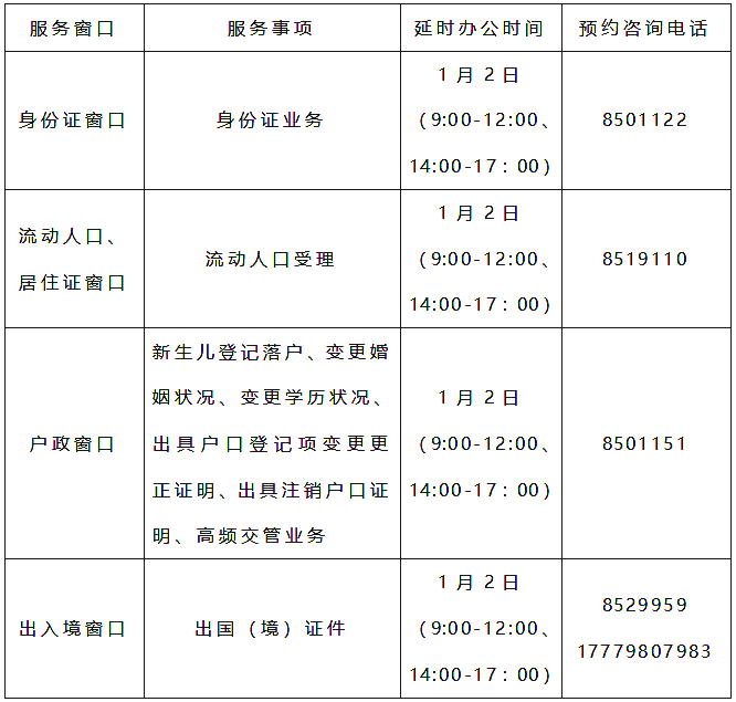 注:市行政服务中心公安专厅于1月1日全天延时服务,昌江公安分局办证大厅于1月3日全天延时服务。