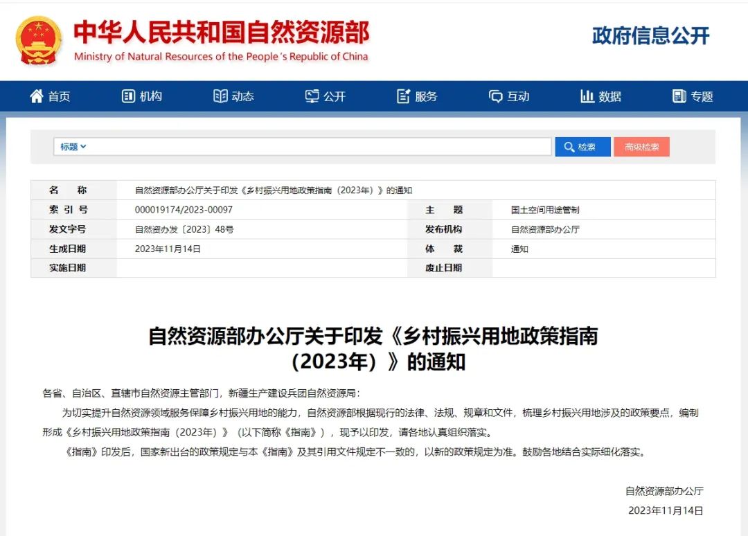 为切实提升自然资源领域服务保障乡村振兴用地的能力,自然资源部根据现行的法律、法规、规章和文件,梳理乡村振兴用地涉及的政策要点,编制形成《乡村振兴用地政策指南(2023年)》(以下简称《指南》),现予以印发,请各地认真组织落实。 《指南》印发后,国家新出台的政策规定与本《指南》及其引用文件规定不一致的,以新的政策规定为准。鼓励各地结合实际细化落实。 《指南》全文内容如下
