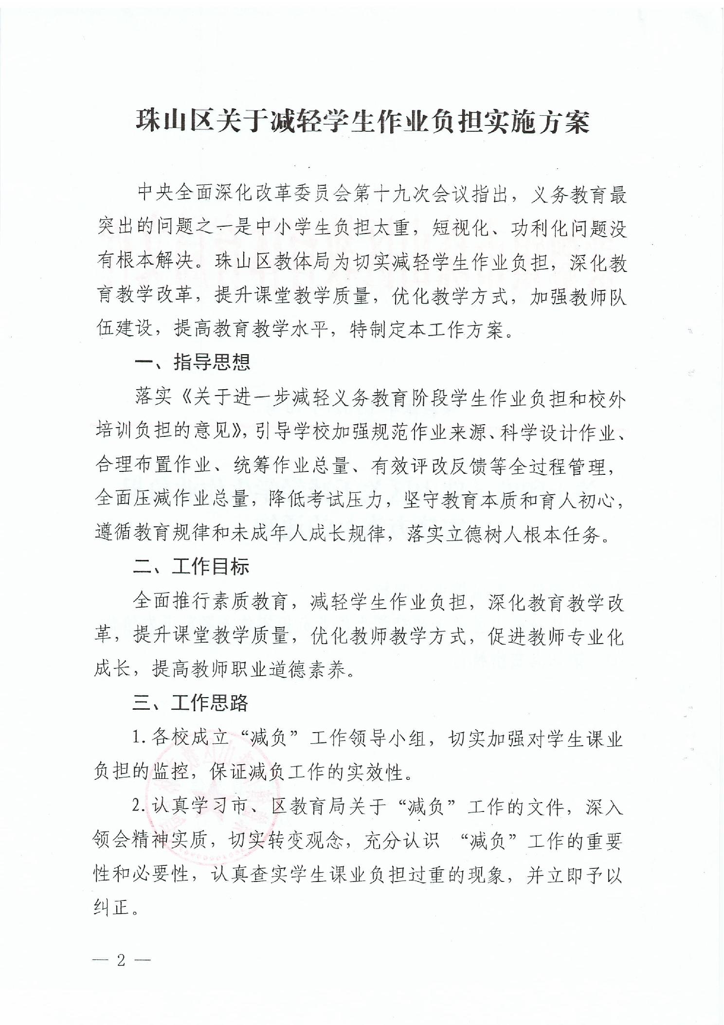 关于印发《珠山区关于减轻学生作业负担实施方案》的通知