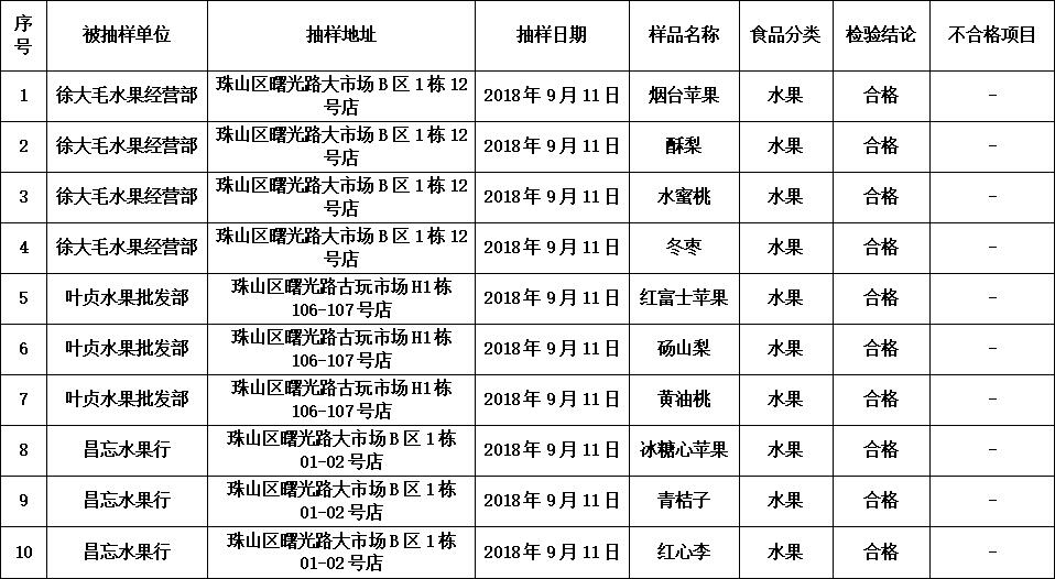 本次对珠山区曙光路大市场B区1栋12号店和珠山区曙光路古玩市场店抽检的食用农产品包括水果类产品共10批次,合格样品10批次,具体信息详见附件。