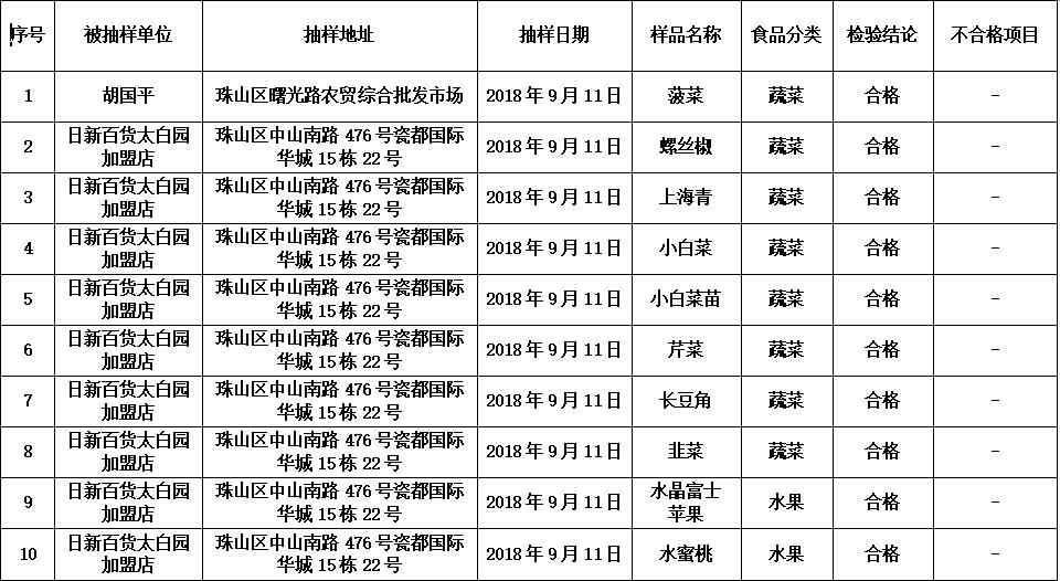 本次对珠山区曙光路农贸综合批发市场和珠山区中山南路476号瓷都国际华城15栋22号抽检的食用农产品包括蔬菜类、水果类产品共10批次,合格样品10批次,具体信息详见附件。