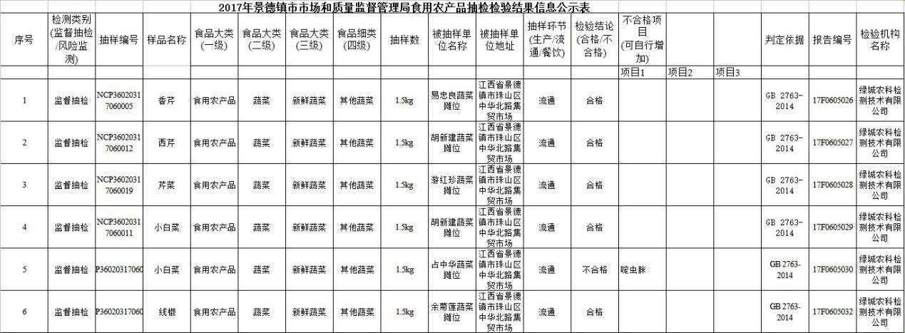 依据《中华人民共和国食品安全法》及其实施条例等有关规定,珠山区市场和质量监督管理局本期公布农产品抽检信息共6批次样品,现将抽检信息公布如下: