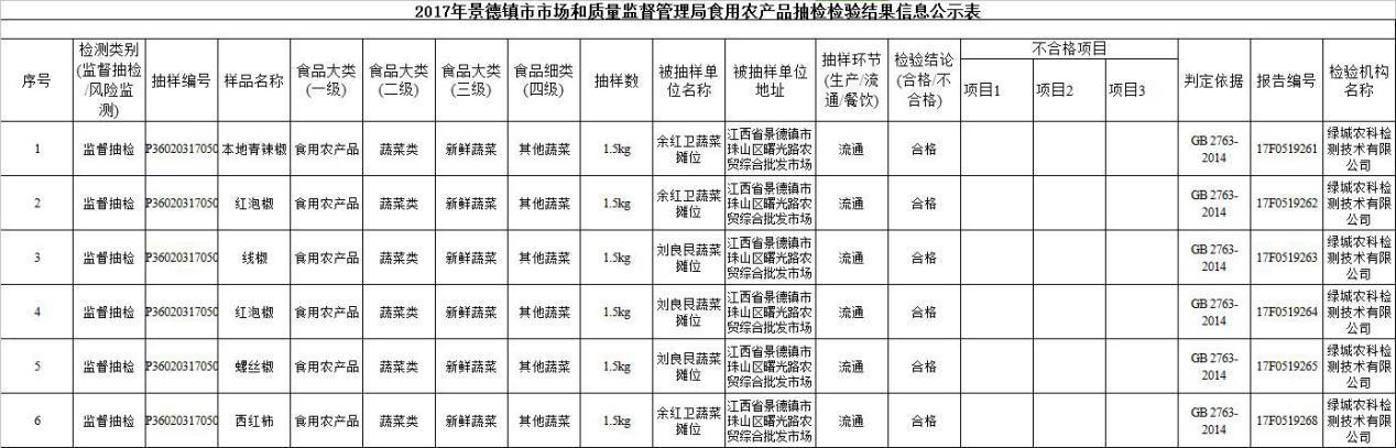 本次对景德镇市珠山区曙光路农贸综合批发市场抽检的食用农产品包括蔬菜类共6批次,全部合格,具体信息详见附件。