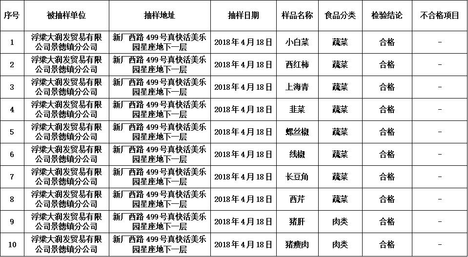 本次对江西省景德镇市珠山区新厂西路499号真快活美乐园星座地下一层抽检的食用农产品包括蔬菜、肉类产品共10批次,合格样品10批次,具体信息详见附件。
