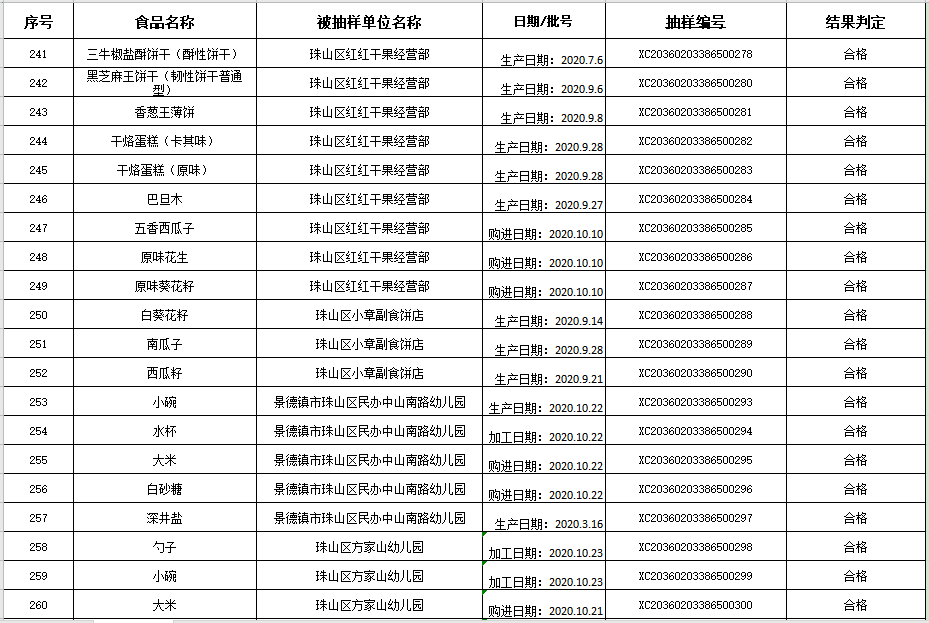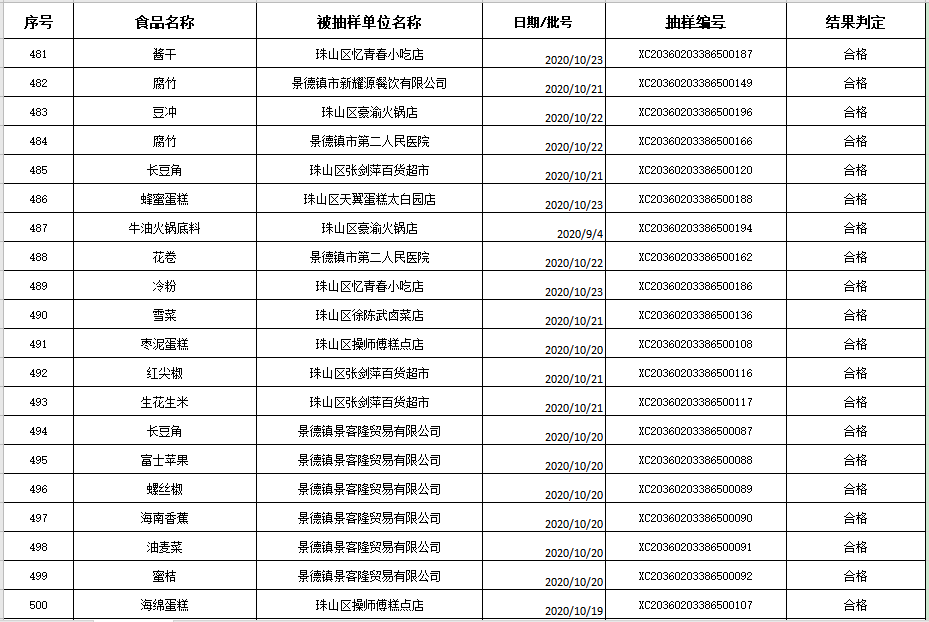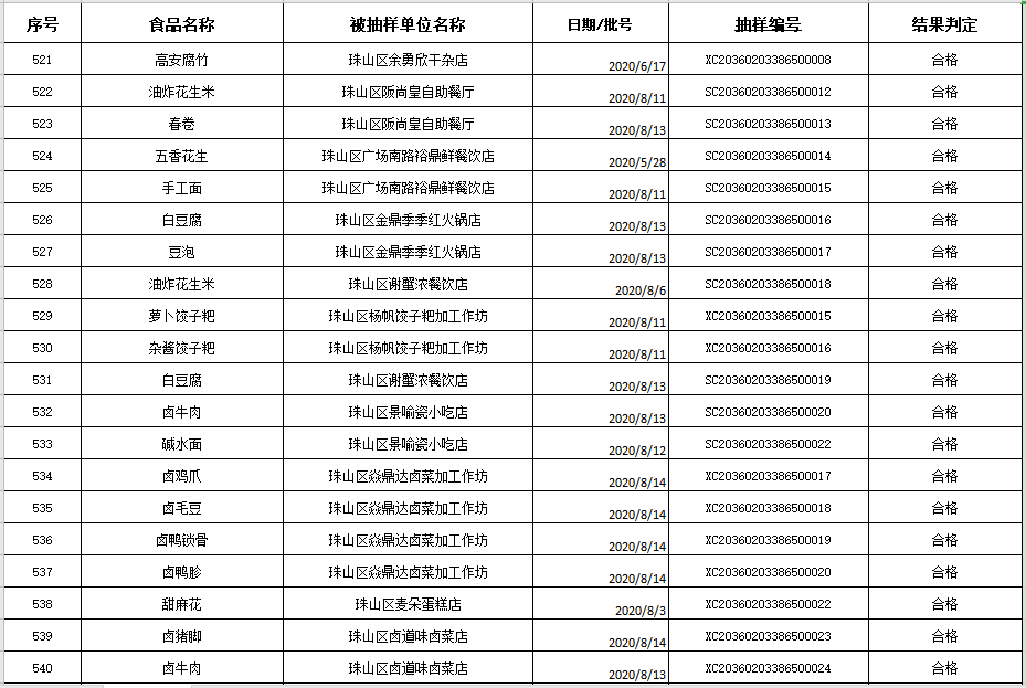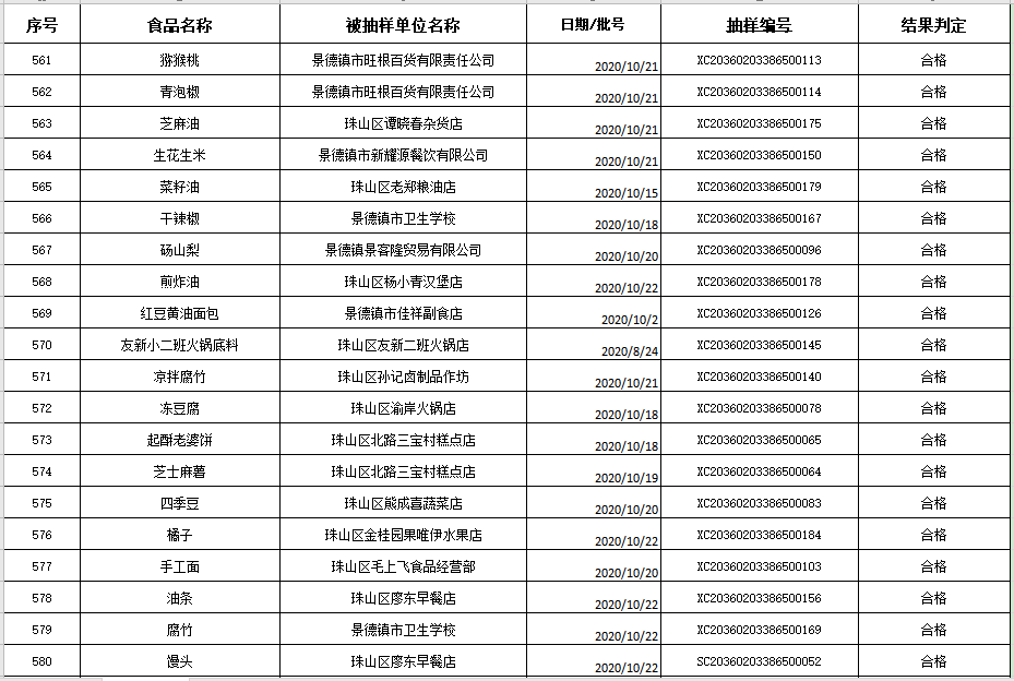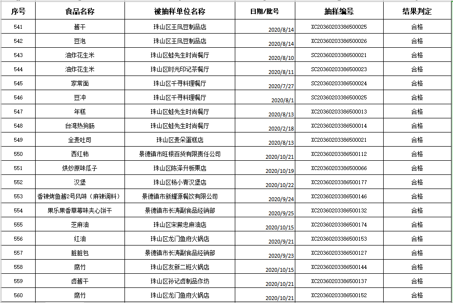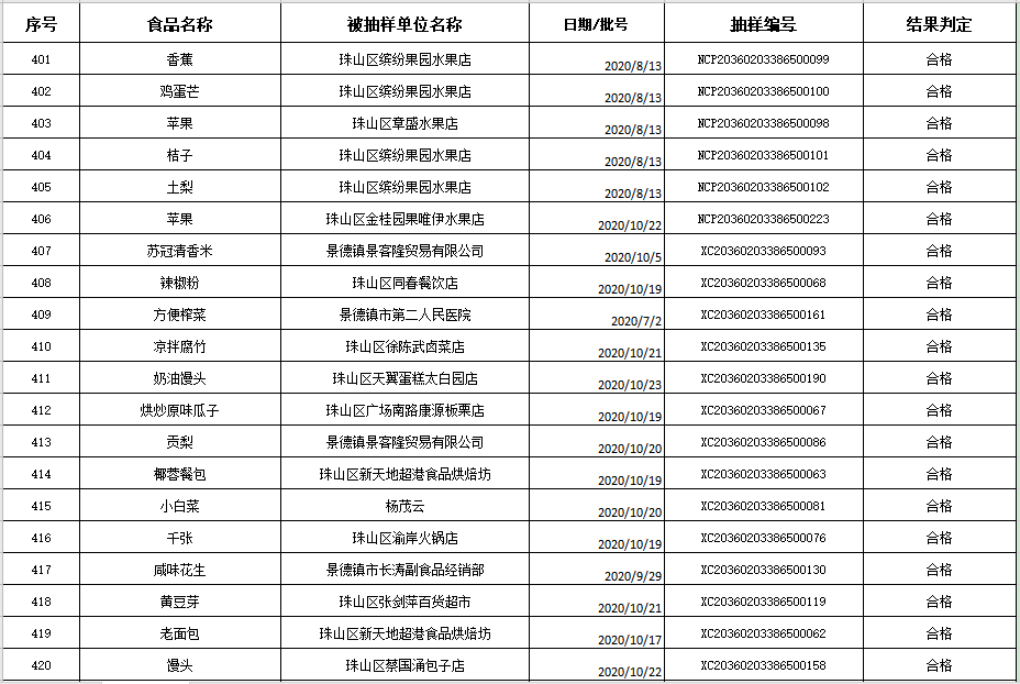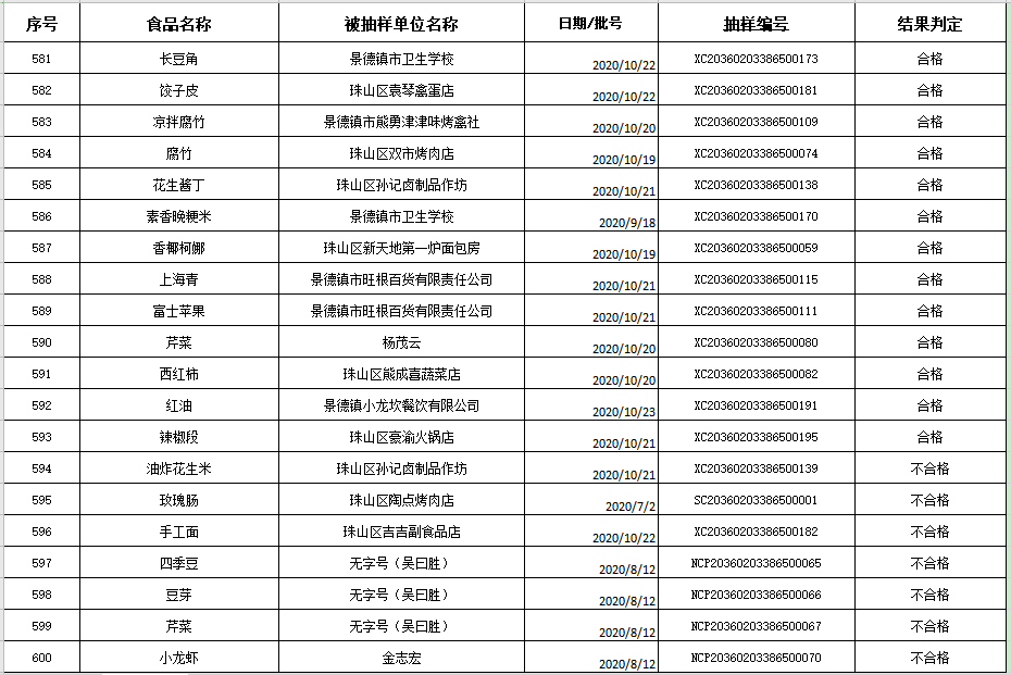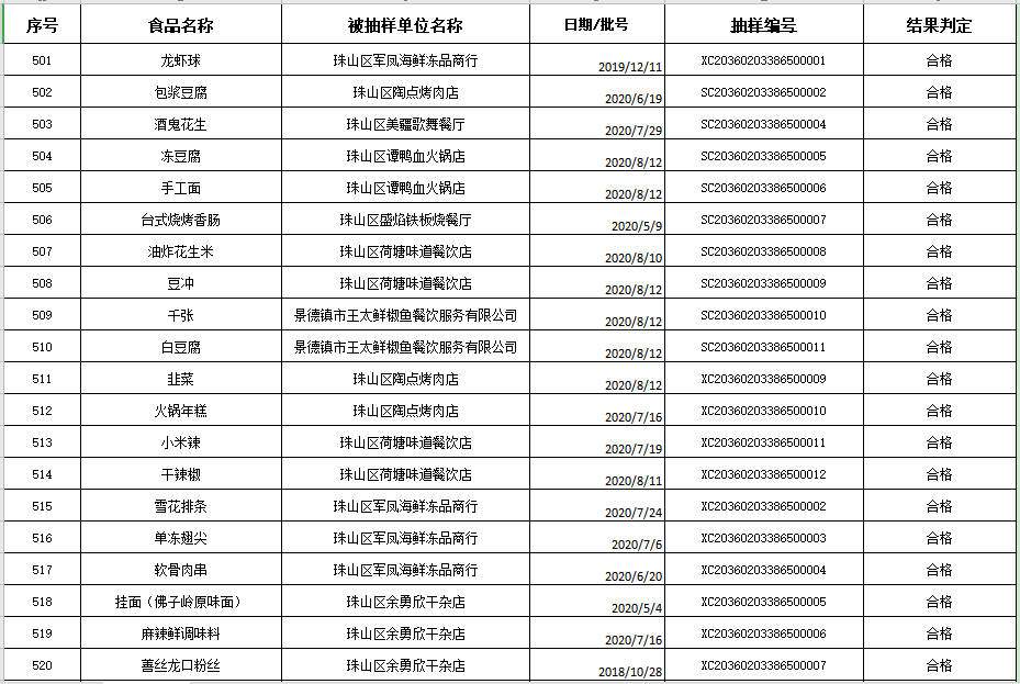 依据《中华人民共和国食品安全法》及其实施条例等有关规定,珠山区市场监督管理局本期公布2020年珠山区食品抽检信息共600批次样品,现将抽检信息公布如下: