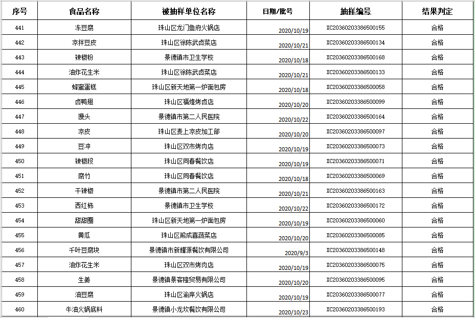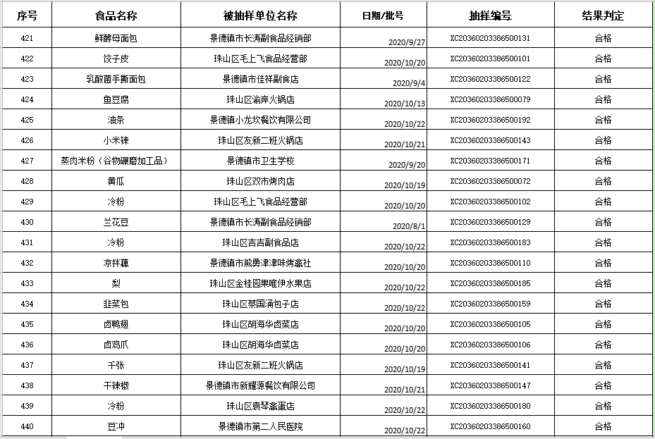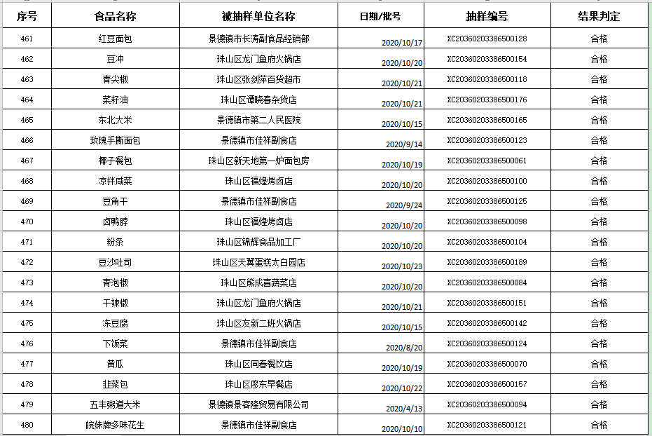 珠山区市场监督管理局2020年食品安全监督抽检信息总公示