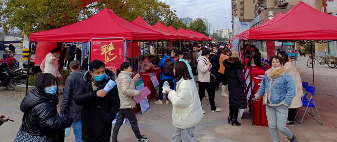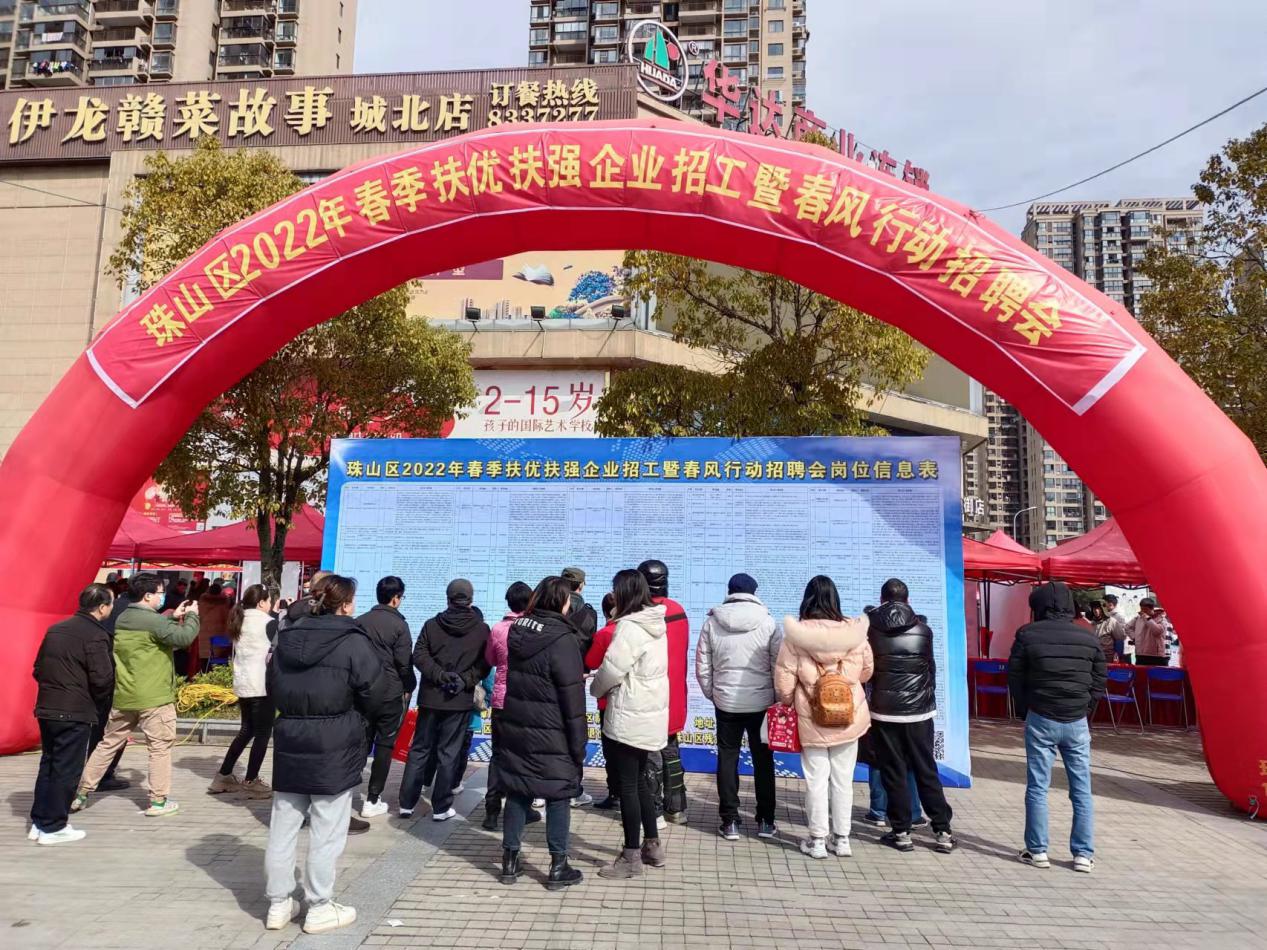 2月21日上午,古镇天御人声鼎沸,川流不息,由珠山区人力资源和社会保障局主办、珠山区就业创业服务中心承办、石狮埠街道等单位协办的珠山区2022年春季扶优扶强企业招工暨春风行动招聘会在华达超市古镇天御店门口隆重举行。