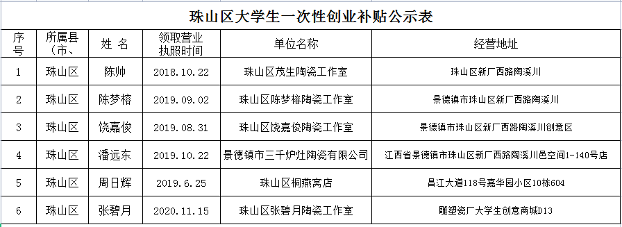 2022年珠山区大学生一次性创业补贴公示(第一批)
