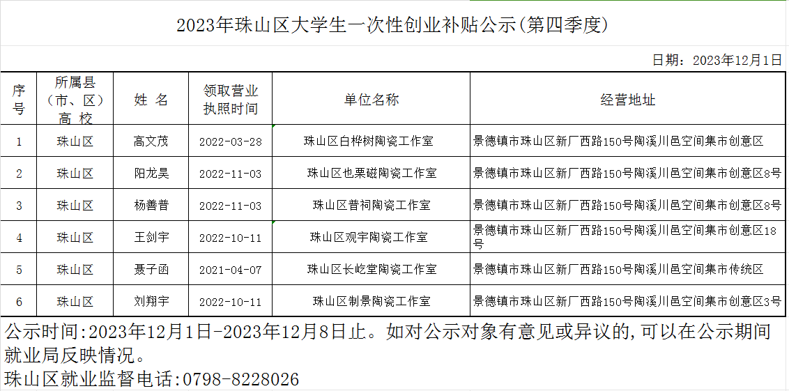 2023年珠山区大学生一次性创业补贴公示(第四季度)