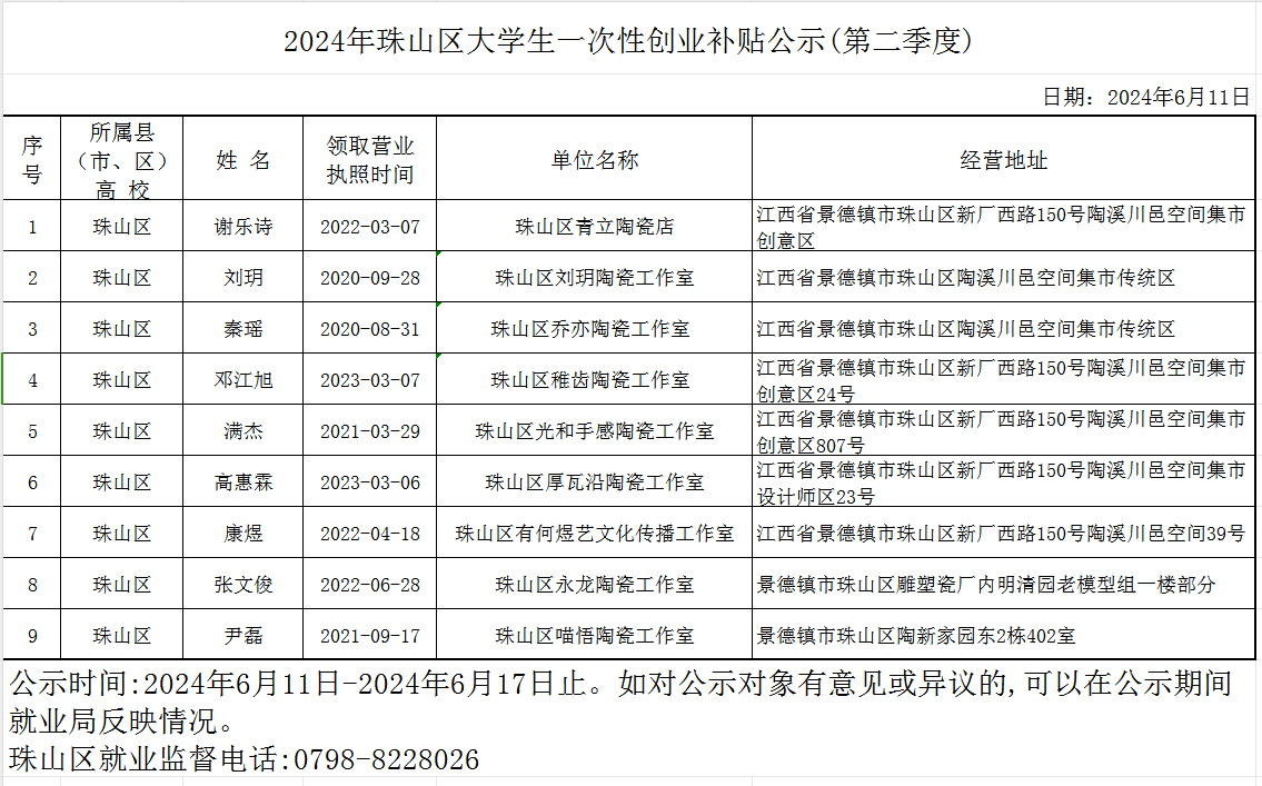 2024年珠山区大学生一次性创业补贴公示(第二季度)