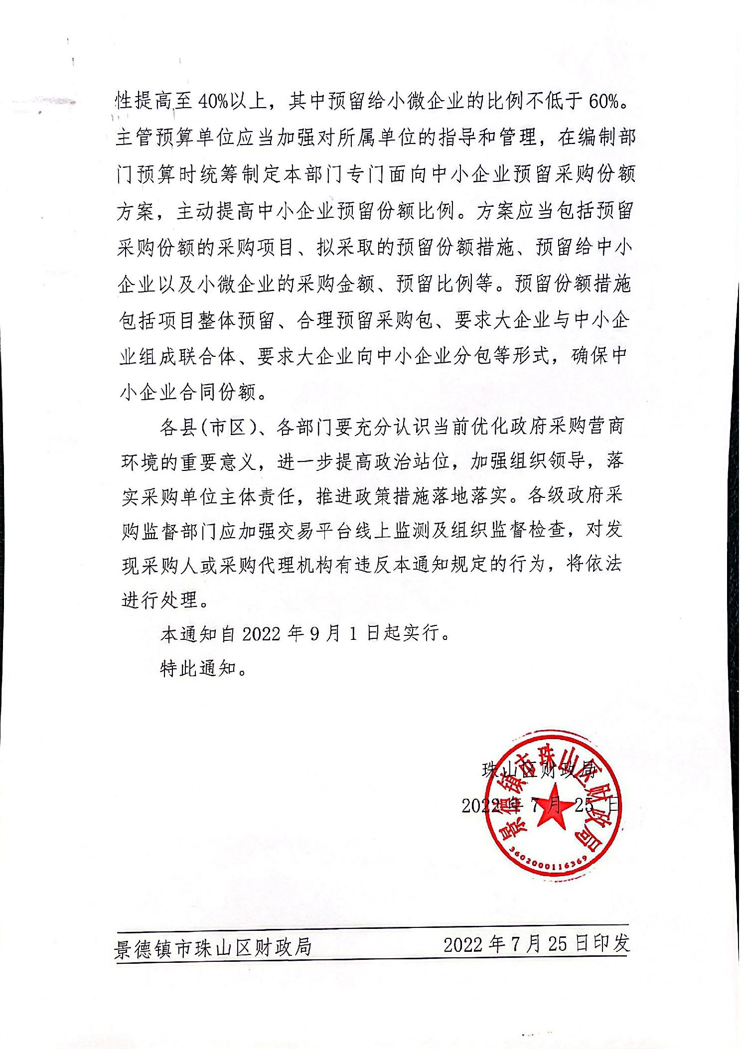 珠⼭区财政局关于落实优化营商环境“⼀号 ⼯程”推进政府采购⼯作的通知