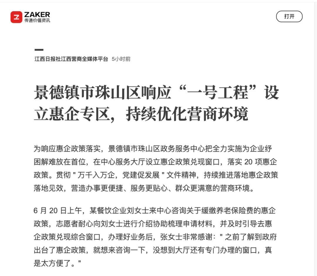 为响应惠企政策落实,景德镇市珠山区政务服务中心把全力实施为企业纾困解难放在首位,在中心服务大厅设立惠企政策兑现窗口,落实 20 项惠企政策。贯彻 " 万千入万企,党建促发展 " 文件精神,持续推进落地惠企政策落地见效,营造办事更便捷、服务更贴心、群众更满意的营商环境。