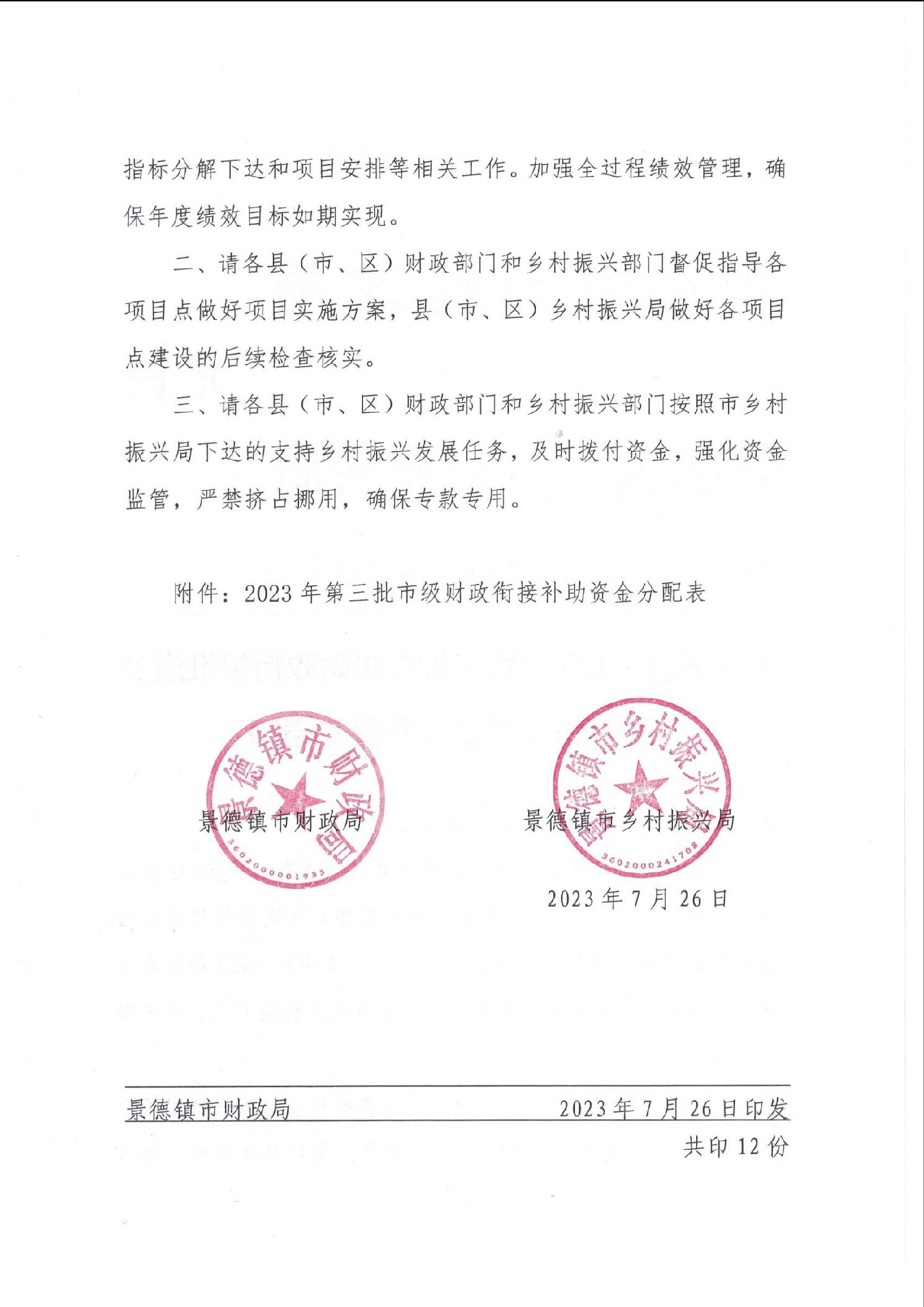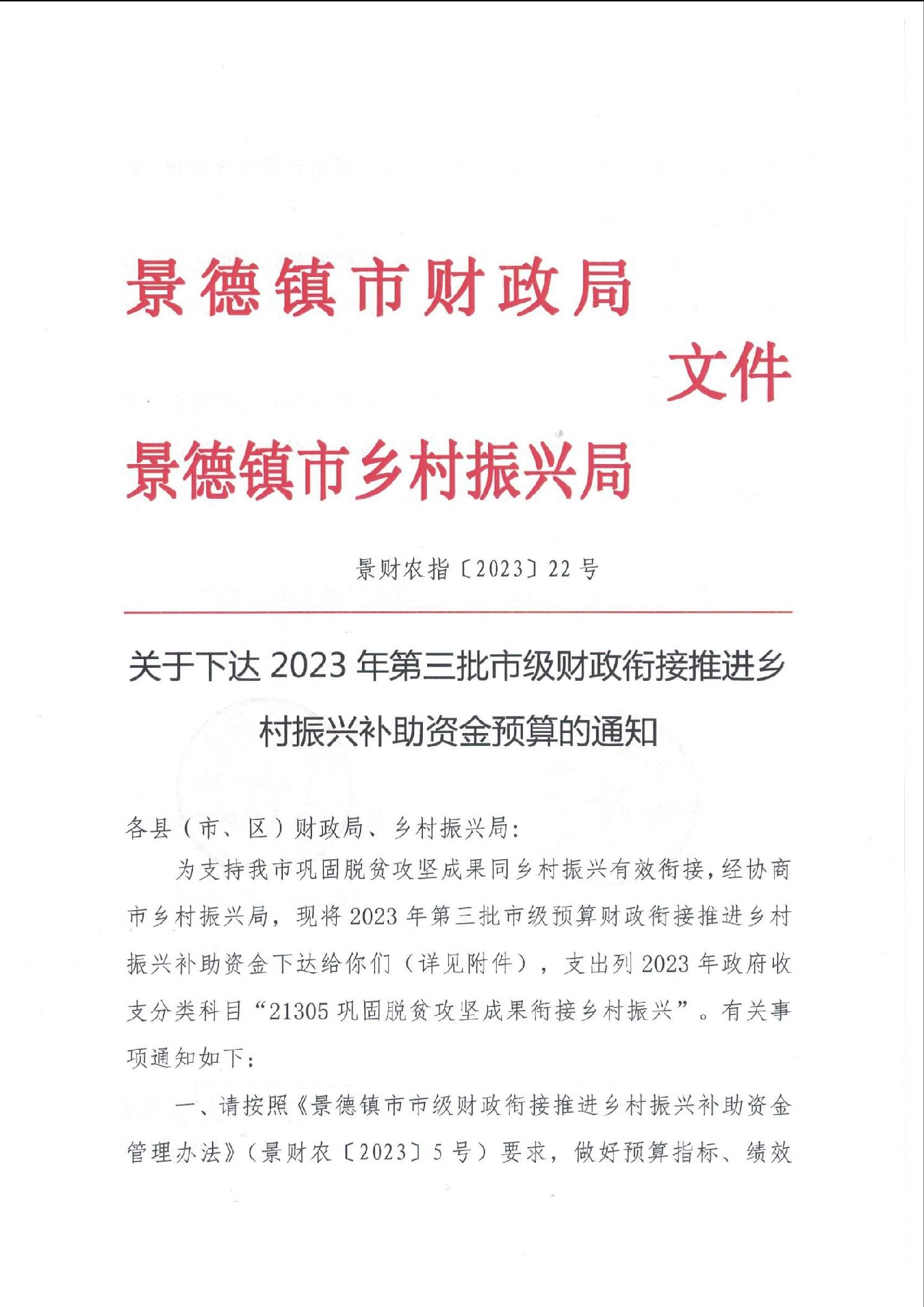 关于下达2023年第三批市级财政衔接推进乡村振兴补助资金预算的通知