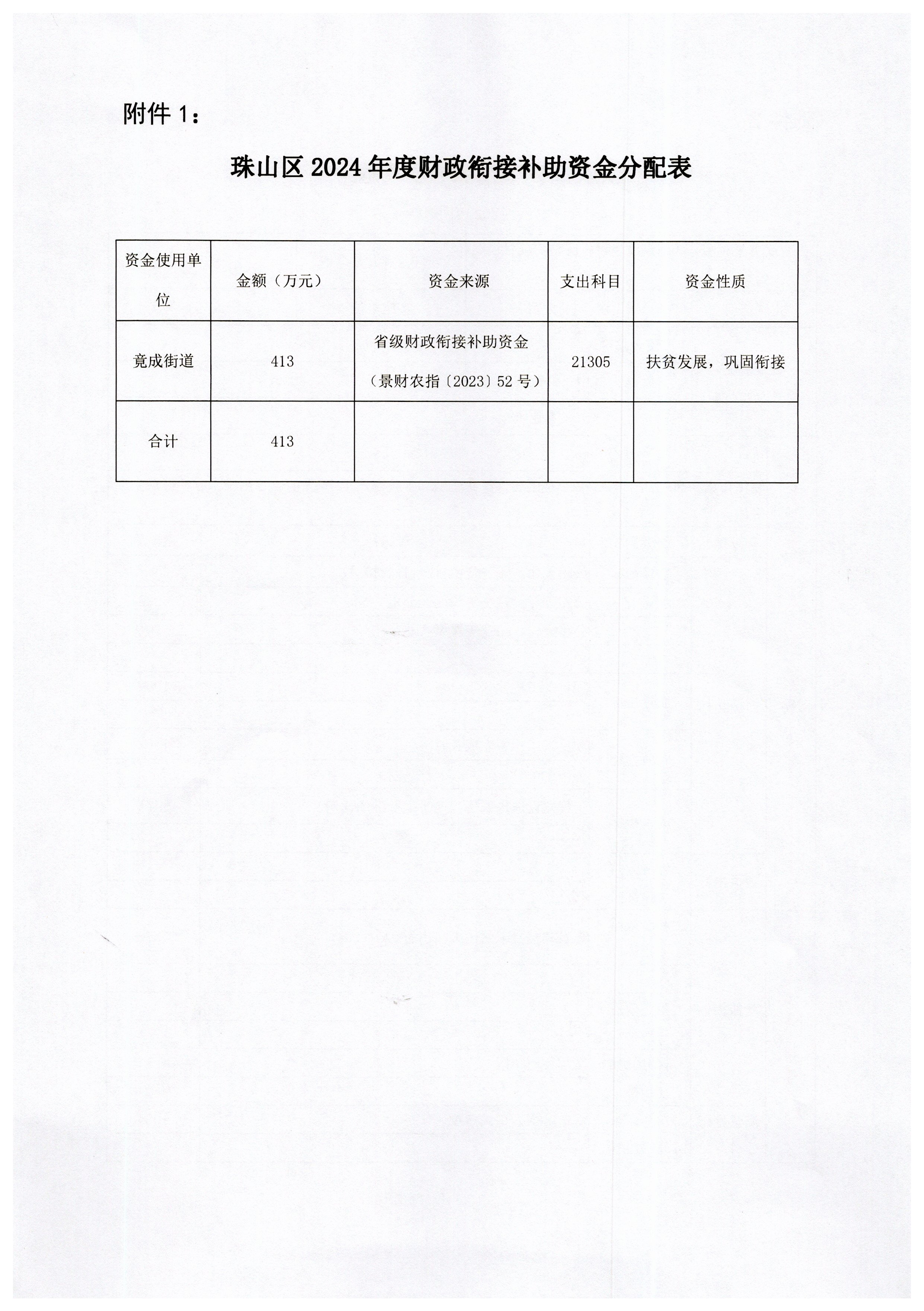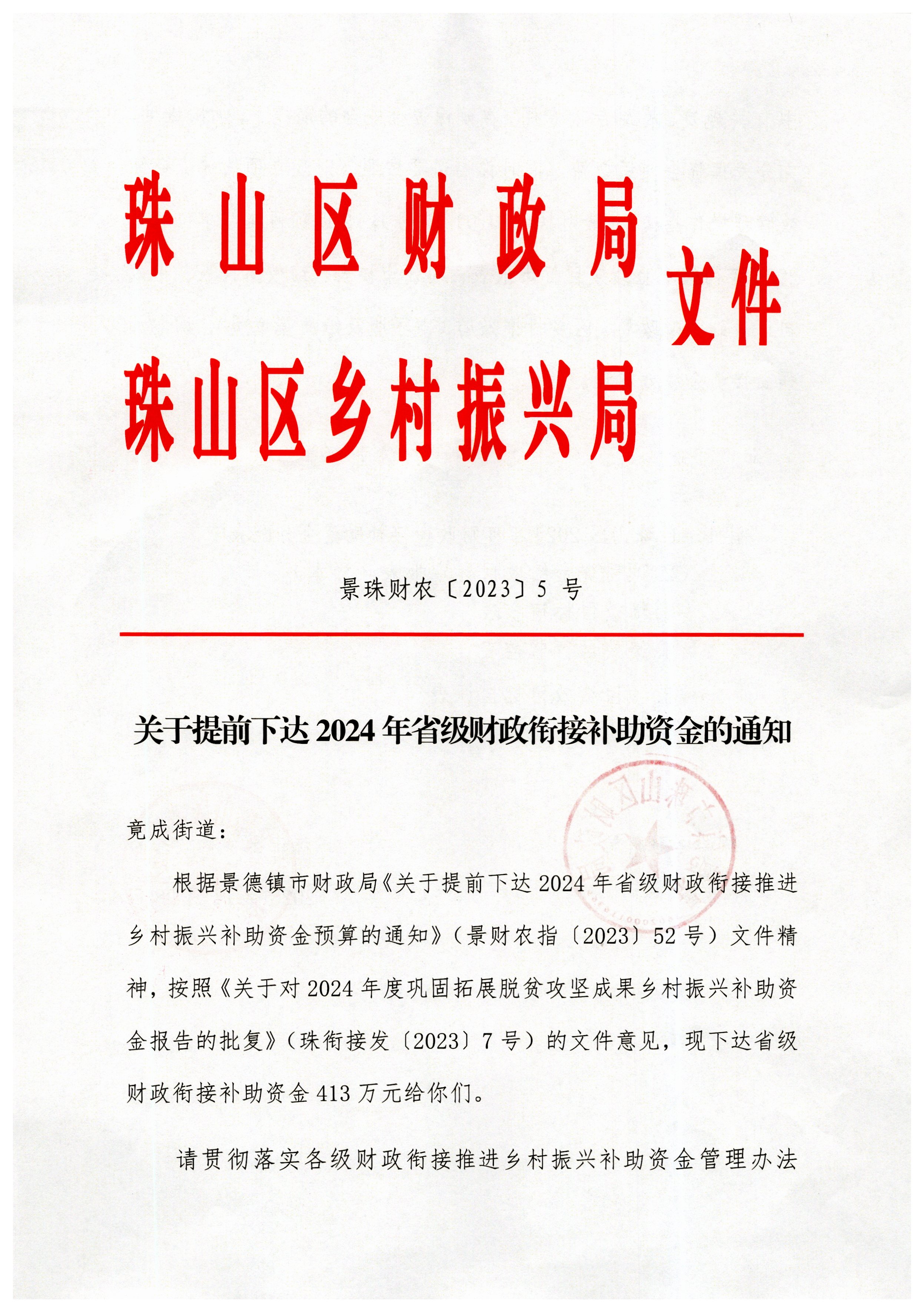 提前下达2024年省级财政衔接补助资金413万元